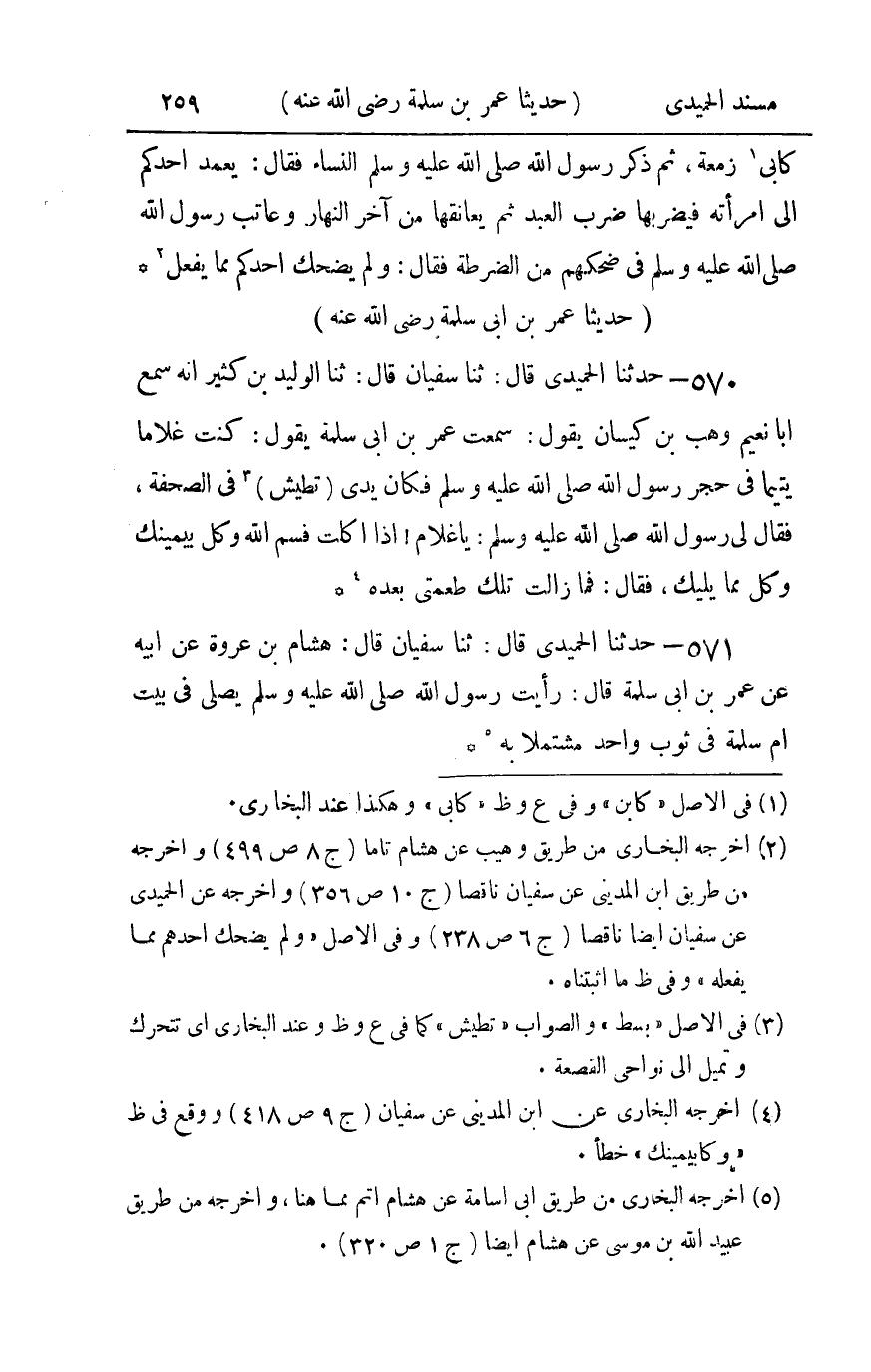 570 - حدثنا الحميدي قال ثنا سفيان قال ثنا الوليد بن كثير أنه سمع أبا نعيم وهب بن كيسان يقول سمعت عمر بن أبي سلمة يقول : كنت غلاما يتيما في حجر رسول الله صلى الله عليه و سلم فكان يدي تطيش في الصحفة فقال لي رسول الله صلى الله عليه و سلم يا غلام إذا أكلت فسم الله وكل بيمينك وكل مما يليك فقال فما زالت تلك طعمتي بعده