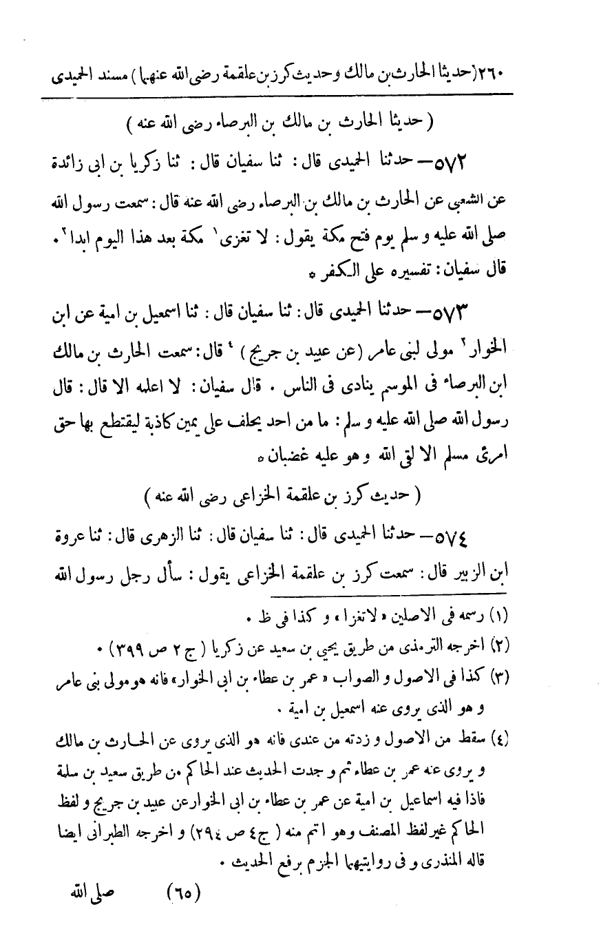 572 - حدثنا الحميدي قال ثنا سفيان قال ثنا زكريا بن أبي زائدة عن الشعبي عن الحارث بن مالك بن البرصاء رضي الله عنه قال : سمعت رسول الله صلى الله عليه و سلم يوم فتح مكة يقول لا تغزى مكة بعد هذا اليوم أبدا قال سفيان تفسيره على الكفر
