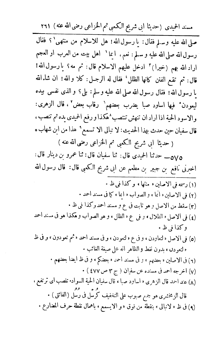 575 - حدثنا الحميدي قال ثنا سفيان قال ثنا عمرو بن دينار قال أخبرني نافع بن جبير بن مطعم عن أبي شريح الكعبي قال قال رسول الله صلى الله عليه و سلم : من كان يؤمن بالله واليوم الآخر فليحسن إلى جاره من كان يؤمن بالله واليوم الآخر فليكرم ضيفه