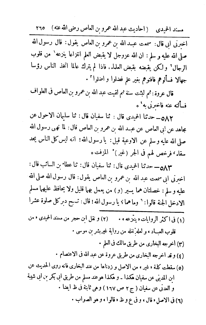 583 - حدثنا الحميدي قال ثنا سفيان قال ثنا عطاء بن السائب قال أخبرني أبي سمعت عبد الله بن عمرو بن العاص يقول قال رسول الله صلى الله عليه و سلم : خصلتان هما يسير ومن يعمل بهما قليل ولا يحافظ عليهما مسلم إلا دخل الجنة قالوا وما هما يا رسول الله قال تسبح دبر كل صلاة عشرا وتكبر عشرا وتحمد عشرا وتسبح عند منامك ثلاثة وثلاثين وتحمد ثلاثة وثلاثين وتكبر أربعا وثلاثين ثم قال سفيان أحدهن أربعا ثلاثين فذلك مائتان وخمسين باللسان وألفان وخمسمائة في الميزان قال عبد الله بن عمرو فأنا رأيت رسول الله صلى الله عليه و سلم يعقدها بيده ثم قال فأيكم يعمل في يومه وليله ألفي سيئة وخمسمائة سيئة قالوا يا رسول الله فكيف لا يحافظ عليهما قال يأتي الشيطان أحدكم فيقول له اذكر كذا اذكر كذا حتى يقوم ولم يقلها قال سفيان هذا أول شيء سألنا عطاء عنه وكان أيوب أمر الناس حين قدم عطاء البصرة أن يأتوه فيسألوه عن هذا [ ص 266 ] آخر الجزء الخامس [ ص 267 ] الجزء السادس من مسند أبي بكر عبد الله بن الزبير الحميدي بسم الله الرحمن الرحيم أخبرنا الشيخ الإمام العالم الزاهد الحافظ تقي الدين أبو محمد عبد الغني بن عبد الواحد بن علي بن سرور المقدسي قال أخبرنا الفقيه أبو الحسن سعد الله بن نصر بن الدجاجي الفقيه الواعظ قال أخبرنا الإمام أبو منصور محمد بن أحمد بن علي المقرىء الخياط قال أخبرنا أبو طاهر عبد الغفار بن محمد بن جعفر بن زيد المؤدب قراءة عليه وأنا أسمع في سنة سبع وعشرين وأربع مائة فأقربه قال ثنا بشر قال