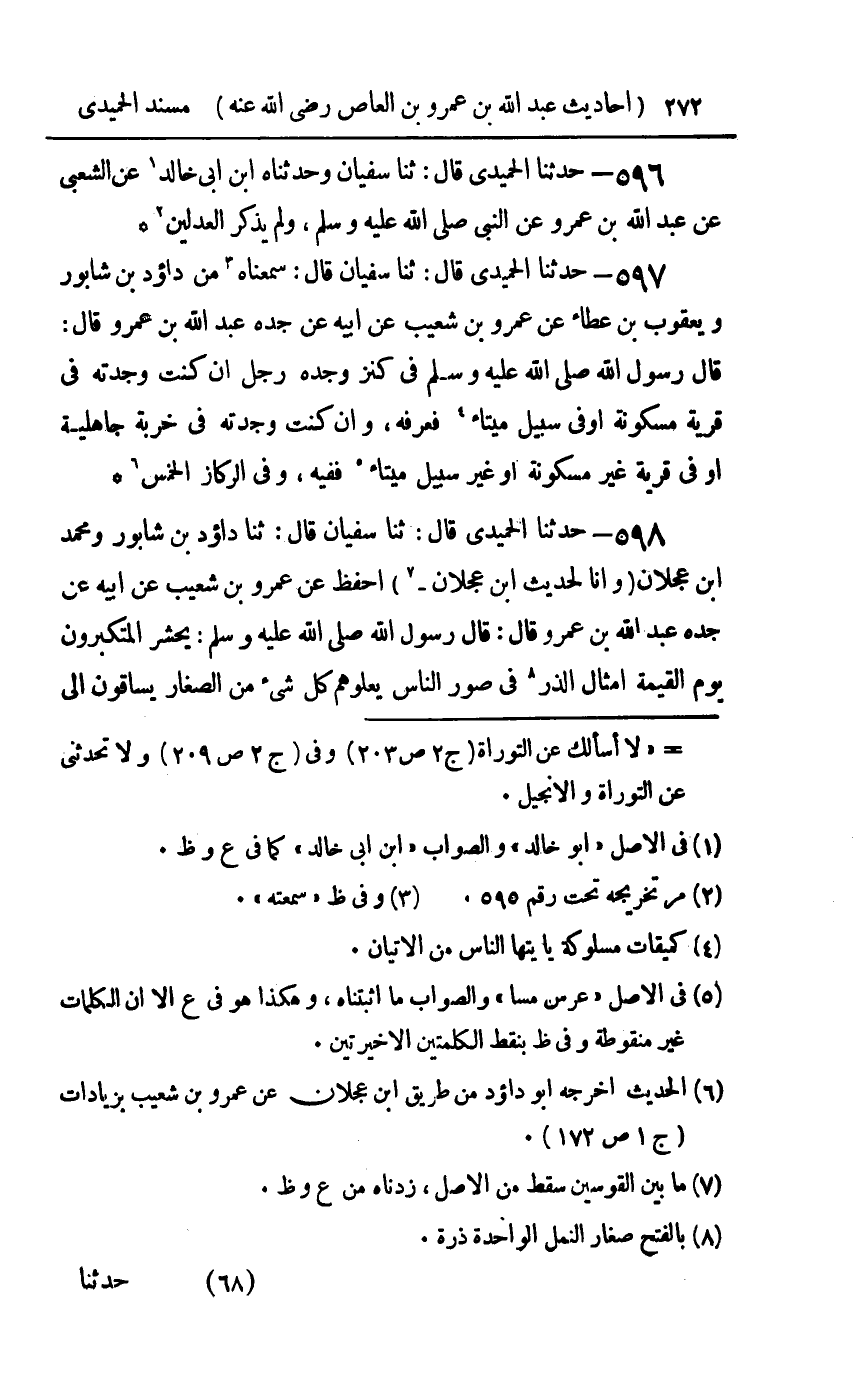 596 - حدثنا الحميدي قال ثنا سفيان وحدثناه بن أبي خالد عن الشعبي عن عبد الله بن عمرو عن النبي صلى الله عليه و سلم : ولم يذكر العدلين