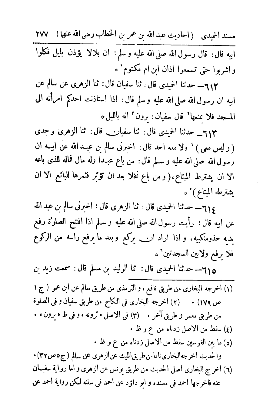 612 - حدثنا الحميدي قال ثنا سفيان قال ثنا الزهري عن سالم عن أبيه أن رسول الله صلى الله عليه و سلم قال : إذا استأذنت أحدكم امرأته إلى المسجد فلا يمنعها قال سفيان يرون أنه بالليل