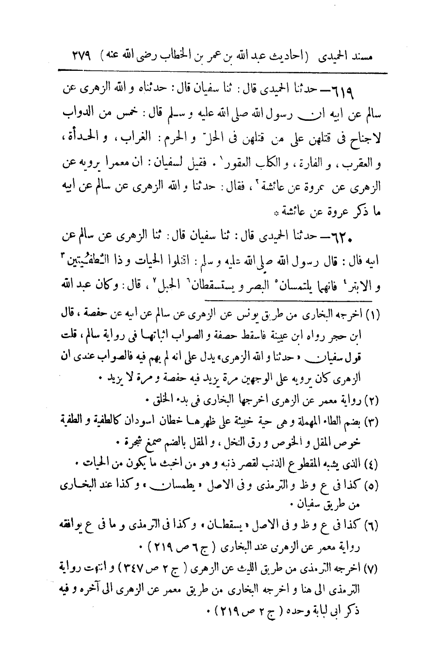 620 - حدثنا الحميدي قال ثنا سفيان قال ثنا الزهري عن سالم عن أبيه قال قال رسول الله صلى الله عليه و سلم : اقتلوا الحيات وذا الطفيتين والأبتر فإنهما يلتمسان البصر ويستسقطان الحبل قال وكان عبد الله يقتل كل حية وجدها فأبصره أبو لبابة أو زيد بن الخطاب وهو يطارد حية فقال أنه قد نهى عن ذوات البيوت قال سفيان كان الزهري أبدا يقول فيه زيد أو أبو لبابة