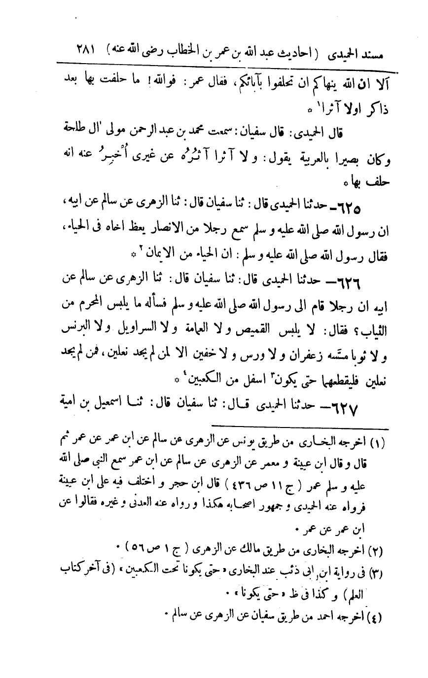 626 - حدثنا الحميدي قال ثنا سفيان قال ثنا الزهري عن سالم عن أبيه : أن رجلا قام إلى رسول الله صلى الله عليه و سلم فسأله ما يلبس المحرم من الثياب فقال لا يلبس القميص ولا العمامة ولا السراويل ولا البرنس ولا ثوبا مسه زعفران ولا ورس ولا خفين إلا لمن لم يجد نعلين فمن لم يجد نعلين فليقطعهما حتى يكون أسفل من الكعبين