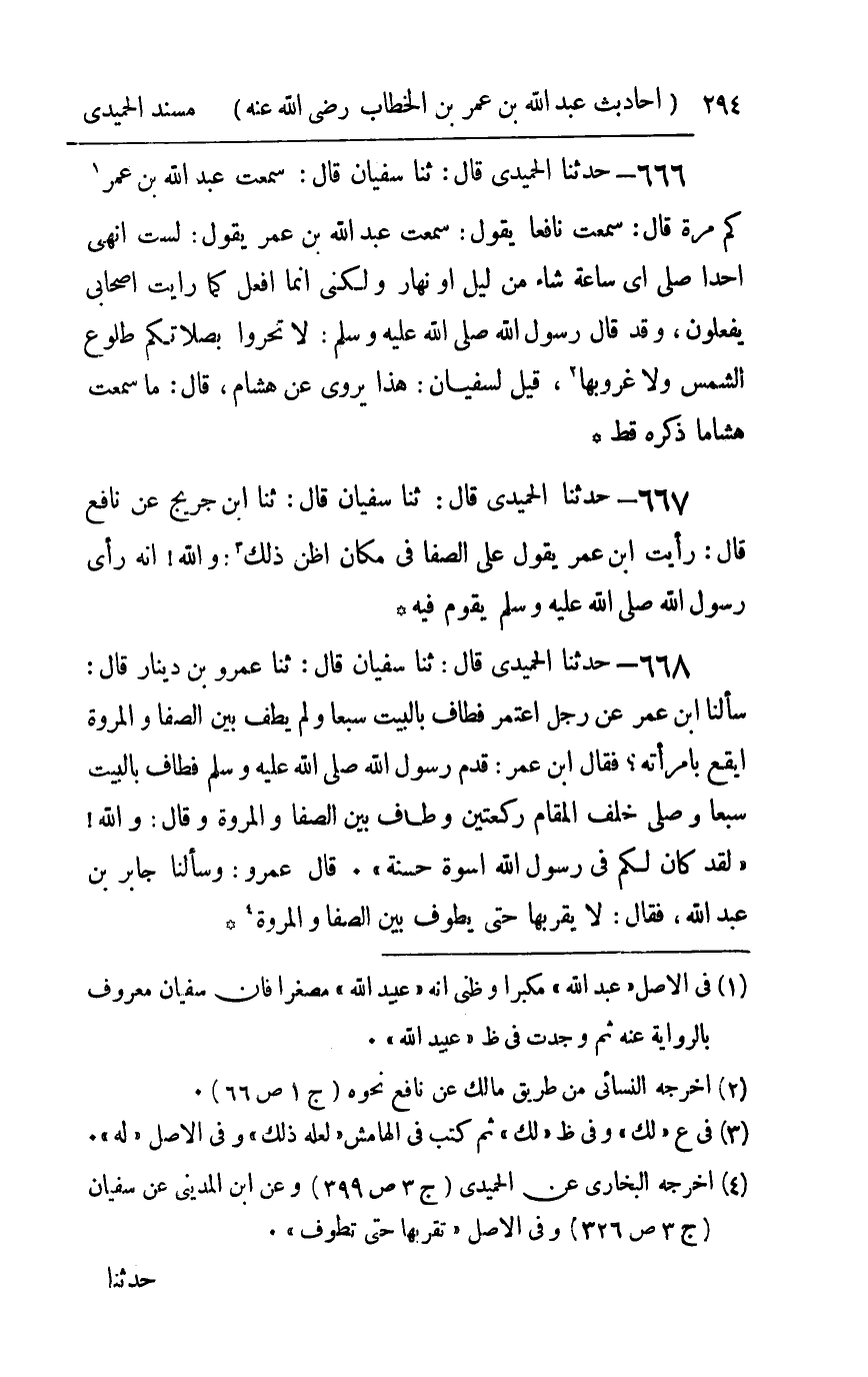 667 - حدثنا الحميدي قال ثنا سفيان قال ثنا بن جريج عن نافع قال رأيت بن عمر يقول على : الصفا في مكان أظن ذلك والله إنه رأى رسول الله صلى الله عليه و سلم يقوم فيه