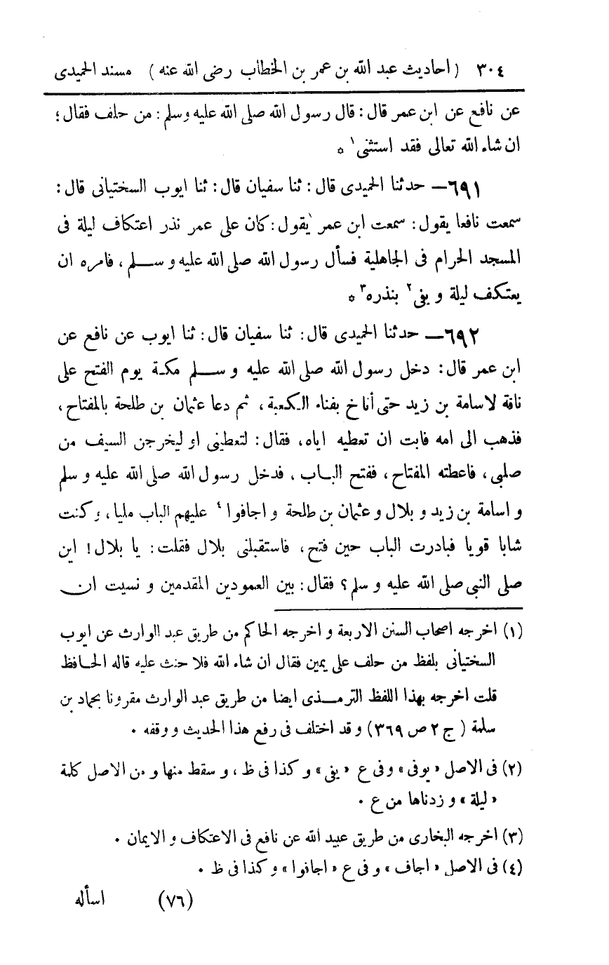 692 - حدثنا الحميدي قال ثنا سفيان قال ثنا أيوب عن نافع عن بن عمر قال : دخل رسول الله صلى الله عليه و سلم مكة يوم الفتح على ناقة لأسامة بن زيد حتى أناخ بفناء الكعبة ثم دعا عثمان بن طلحة بالمفتاح فذهب إلى أمه فأبت أن تعطيه إياه فقال لتعطيني أو ليخرجن السيف من صلبي فأعطته المفتاح ففتح الباب فدخل رسول الله صلى الله عليه و سلم وأسامة بن زيد وبلال وعثمان بن طلحة وأجافوا عليهم الباب مليا وكنت شابا قويا فبادرت الباب حين فتح فاستقبلني بلال فقلت يا بلال أين صلى النبي صلى الله عليه و سلم فقال بين العمودين المقدمين ونسيت أن أن أسأله كم صلى