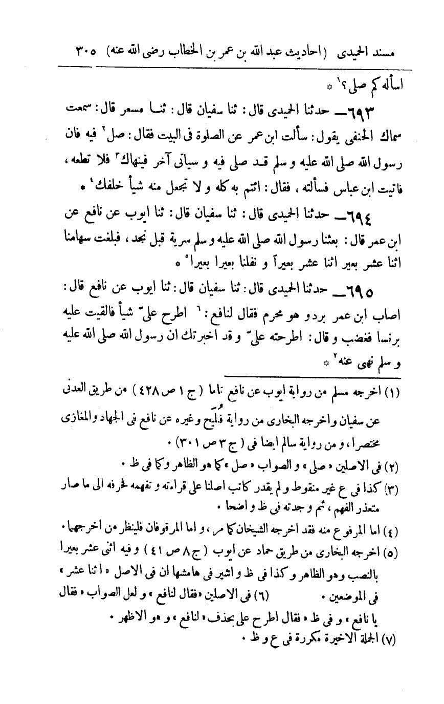 694 - حدثنا الحميدي قال ثنا سفيان قال ثنا أيوب عن نافع عن بن عمر قال : بعثنا رسول الله صلى الله عليه و سلم سرية قبل نجد فبلغت سهامنا اثنا عشر بعير اثنا عشر بعيرا ونفلنا بعيرا بعيرا