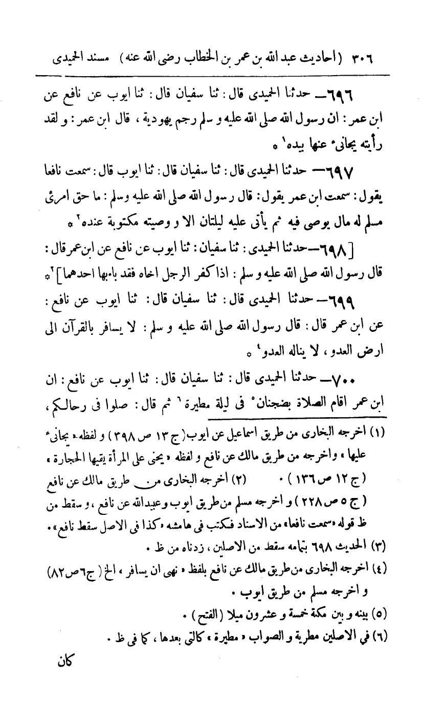 699 - حدثنا الحميدي قال ثنا سفيان قال ثنا أيوب عن نافع عن بن عمر قال قال رسول الله صلى الله عليه و سلم : لا يسافر بالقرآن الى أرض العدو لا يناله العدو