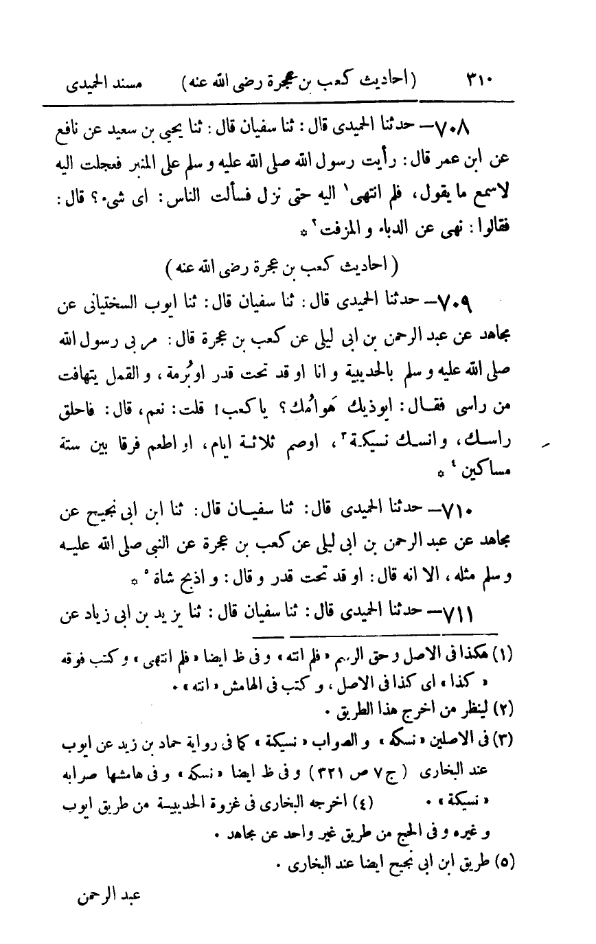 710 - حدثنا الحميدي قال ثنا سفيان قال ثنا بن أبي نجيح عن مجاهد عن عبد الرحمن بن أبي ليلى عن كعب بن عجرة عن النبي صلى الله عليه و سلم : مثله إلا أنه قال أوقد تحت قدر وقال وأذبح شاة
