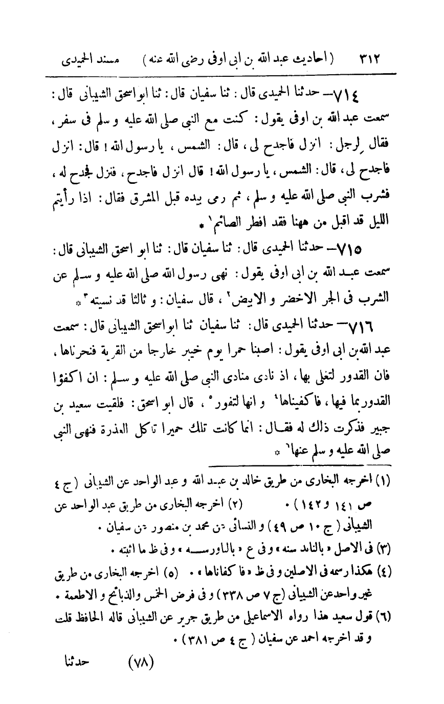 716 - حدثنا الحميدي قال ثنا سفيان أبو إسحاق الشيباني قال سمعت عبد الله بن أبي أوفى يقول : أصبنا حمرا يوم خيبر خارجا من القرية فنحرناها فإن القدور لتغلي بها إذ نادى منادي النبي صلى الله عليه و سلم أن اكفؤا القدور بما فيها فأكفيناها وإنها لتفور قال أبو إسحاق فلقيت سعيد بن جبير فذكرت ذلك له فقال إنما كانت تلك حميرا تأكل العذرة فنهى النبي صلى الله عليه و سلم عنها