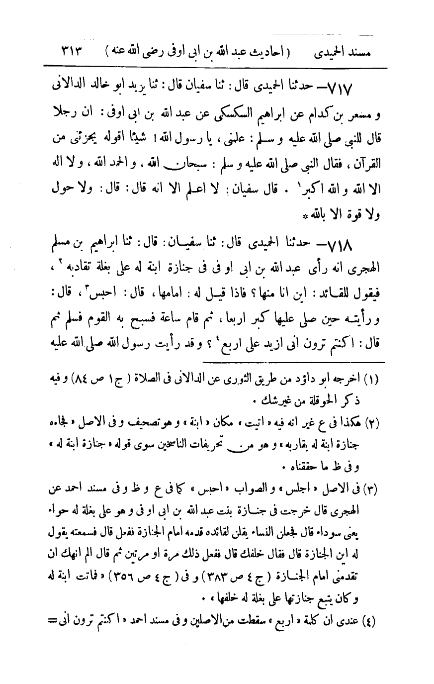 718 - حدثنا الحميدي قال ثنا سفيان قال ثنا إبراهيم بن مسلم الهجري أنه رأى عبد الله بن أبي أوفى في جنازة ابنة له على بغلة يقاربه فيقول للقائد : أين أنا منها فإذا قيل له أمامها قال أحبس قال ورأيته حين صلى عليها كبر أربعا ثم قام ساعة فسبح به القوم فسلم ثم قال أكنتم ترون أني أزيد على أربع وقد رأيت رسول الله صلى الله عليه و سلم كبر أربعا وسمع نساء يرثين فنهاهن وقال سمعت رسول الله صلى الله عليه و سلم ينهى عن المراثي