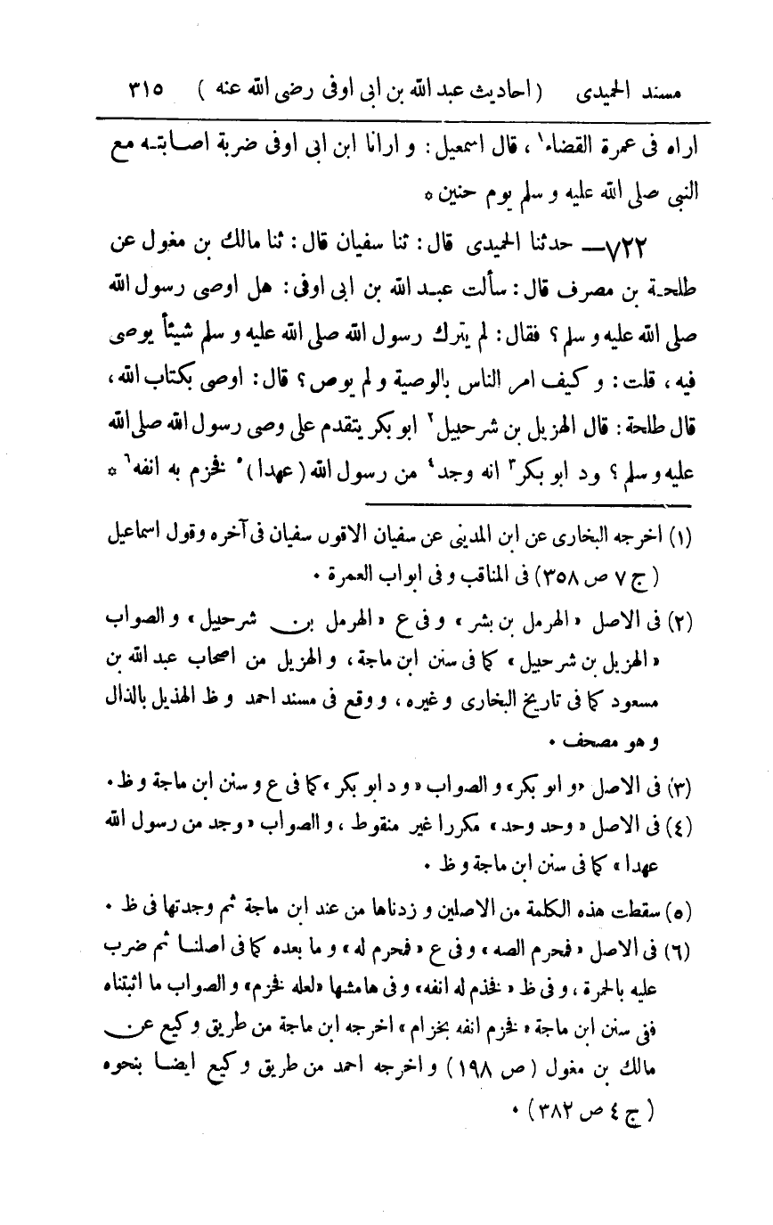 722 - حدثنا الحميدي قال ثنا سفيان قال ثنا مالك بن مغول عن طلحة بن مصرف قال سألت عبد الله بن أبي أوفى : هل أوصى رسول الله صلى الله عليه و سلم فقال لم يترك رسول الله صلى الله عليه و سلم شيئا يوصي فيه قلت وكيف أمر الناس بالوصية ولم يوص قال أوصى بكتاب الله قال طلحة قال الهزيل بن شرحبيل أبو بكر يتقدم على وصى رسول الله صلى الله عليه و سلم ود أبو بكر أنه وجد من رسول الله عهدا فخزم به أنفه
