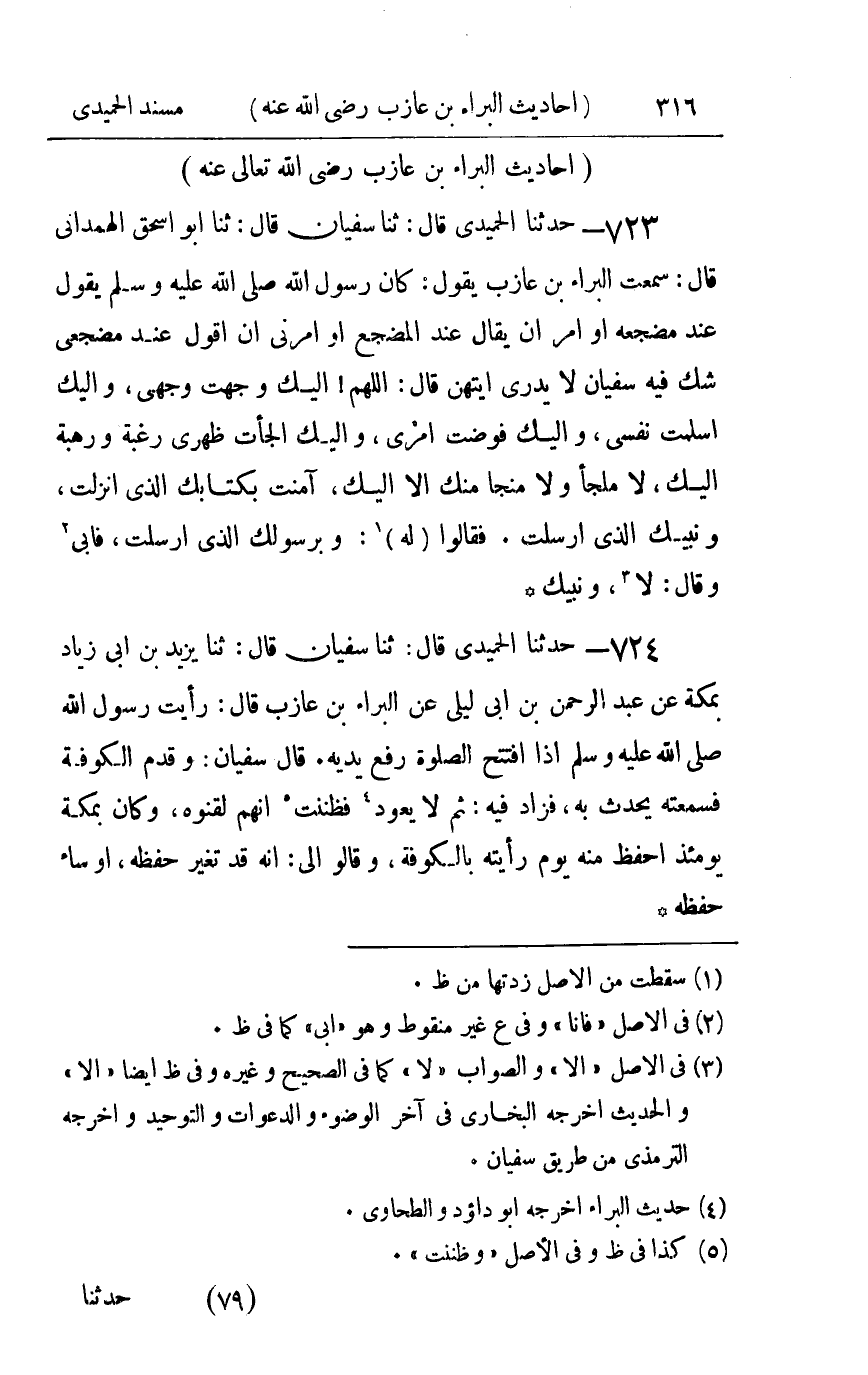 723 - حدثنا الحميدي قال ثنا سفيان قال ثنا أبو إسحاق الهمداني قال سمعت البراء بن عازب يقول : كان رسول الله صلى الله عليه و سلم يقول عند مضجعه أو أمر أن يقال عند المضجع أو أمرني أن أقول عند مضجعي شك فيه سفيان لا يدري أيتهن قال اللهم إليك وجهت وجهي وإليك أسلمت نفسي وإليك فوضت أمري وإليك الجأت ظهري رغبة ورهبة إليك لا ملجأ ولا منجا منك الا إليك آمنت بكتابك الذي أنزلت ونبيك الذي أرسلت فقالوا له وبرسولك الذي أرسلت فأبى وقال لا ونبيك