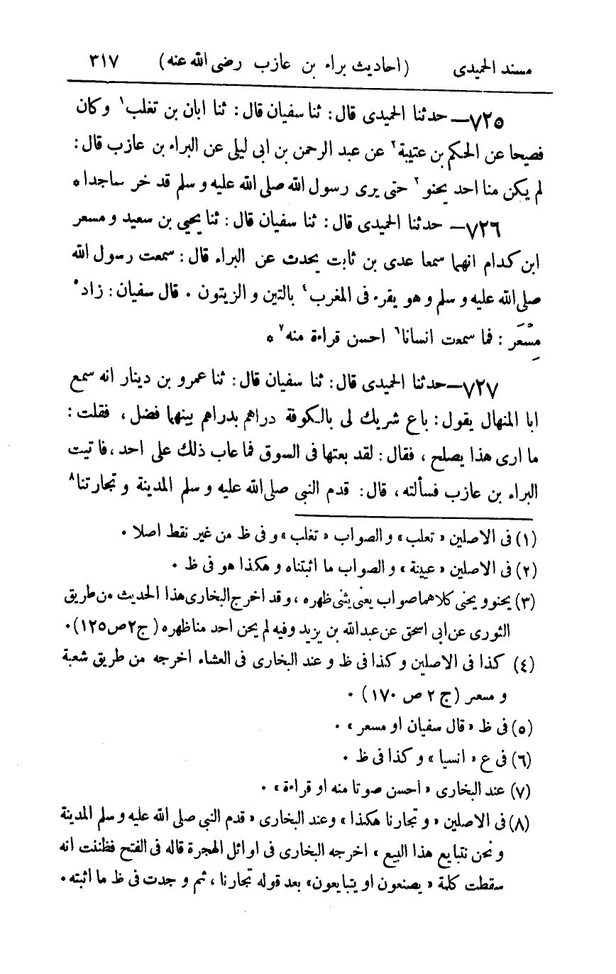 726 - حدثنا الحميدي قال ثنا سفيان قال ثنا يحيى بن سعيد ومسعر بن كدام أنهما سمعا عدي بن ثابت يحدث عن البراء قال : سمعت رسول الله صلى الله عليه و سلم وهو يقرء في المغرب بالتين والزيتون قال سفيان زاد مسعر فما سمعت انسانا أحسن قراءة منه