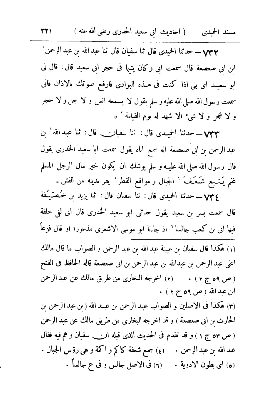 733 - حدثنا الحميدي قال ثنا سفيان قال ثنا عبد الله بن عبد الرحمن بن أبي صعصعة أنه سمع أباه يقول سمعت أبا سعيد الخدري يقول قال رسول الله صلى الله عليه و سلم : يوشك أن يكون خير مال الرجل المسلم غنم يتبع شعف الجبال ومواقع القطر يفر بدينه من الفتن