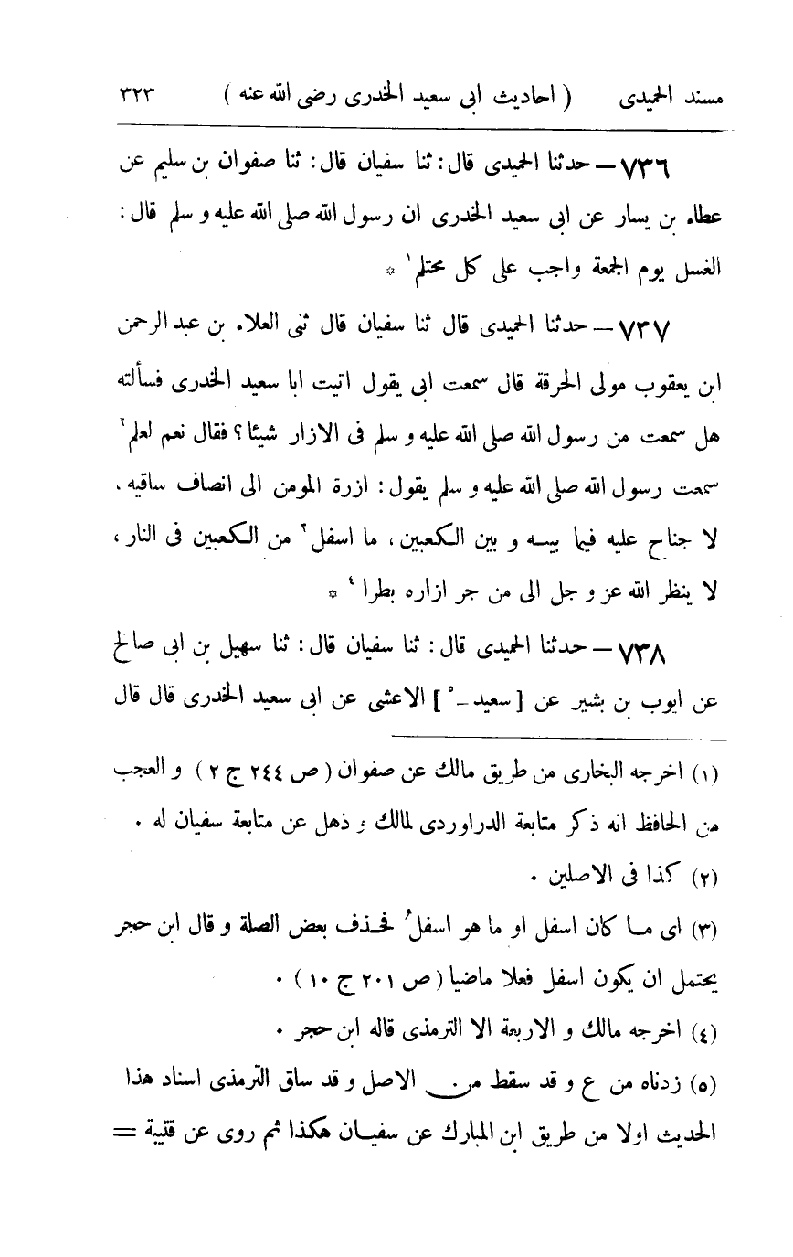 736 - حدثنا الحميدي قال ثنا سفيان قال ثنا صفوان بن سليم عن عطاء بن يسار عن أبي سعيد الخدري أن رسول الله صلى الله عليه و سلم قال : الغسل يوم الجمعة واجب على كل محتلم