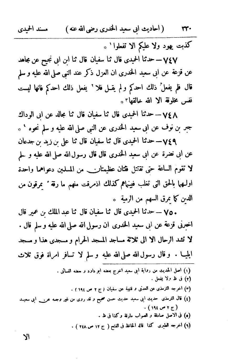 750 - حدثنا الحميدي قال ثنا سفيان قالك ثنا عبد الملك بن عمير قال أخبرني قزعة عن أبي سعيد الخدري أن رسول الله صلى الله عليه و سلم قال : لا تشد الرحال إلا إلى ثلاثة مساجد المسجد الحرام ومسجدي هذا ومسجد إيليا وقال رسول الله صلى الله عليه و سلم لا تسافر امرأة فوق ثلاث إلا ومعها ذو محرم ونهى رسول الله صلى الله عليه و سلم عن صلاة بعد العصر حتى تغرب الشمس وعن صلاة بعد الصبح حتى تطلع الشمس ونهى عن صيام يومين يوم الأضحى ويوم الفطر