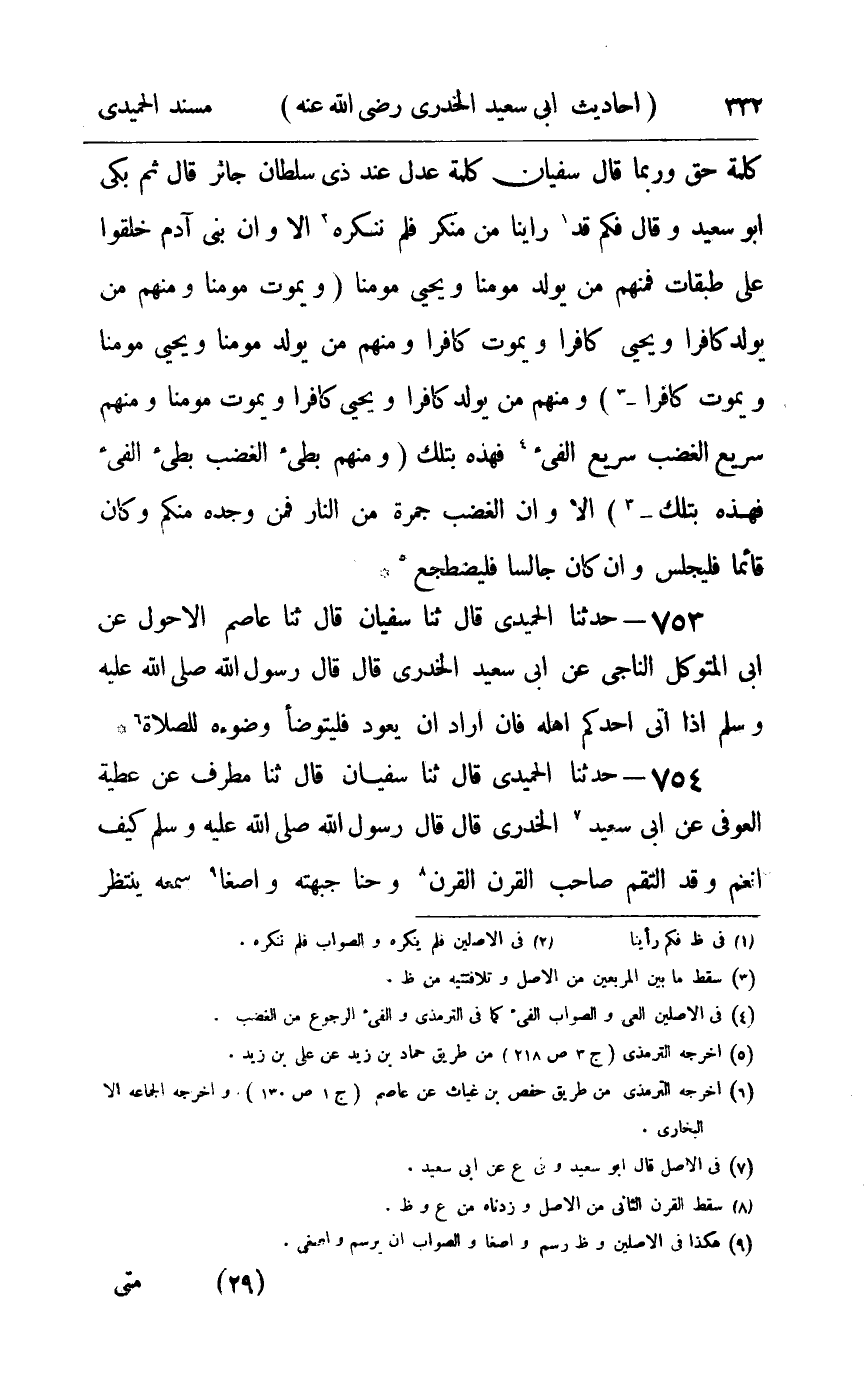 753 - حدثنا الحميدي قال ثنا سفيان قال ثنا عاصم الأحول عن أبي المتوكل الناجي عن أبي سعيد الخدري قال قال رسول الله صلى الله عليه و سلم : إذا أتى أحدكم أهله فإن أراد أن يعود فليتوضأ وضوءه للصلاة