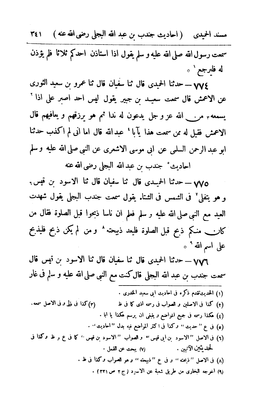 775 - حدثنا الحميدي قال ثنا سفيان قال ثنا الأسود بن قيس وهو يتفلى في الشمس في الشتاء يقول سمعت جندب البجلي يقول : شهدت العيد مع النبي صلى الله عليه و سلم فعلم أن ناسا ذبحوا قبل الصلاة فقال من كان منكم ذبح قبل الصلاة فليعد ذبيحته ومن لم يكن ذبح فليذبح على اسم الله