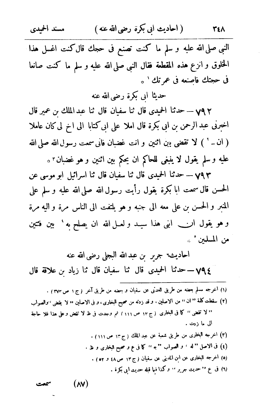 792 - حدثنا الحميدي قال ثنا سفيان قال ثنا عبد الملك بن عمير قال أخبرني عبد الرحمن بن أبي بكرة قال إملأ علي أبي كتابا الى أخ لي كان عاملا أن لا تقضي بين اثنين وأنت غضبان فإني سمعت رسول الله صلى الله عليه و سلم يقول : لا ينبغي للحاكم أن يحكم بين اثنين وهو غضبان