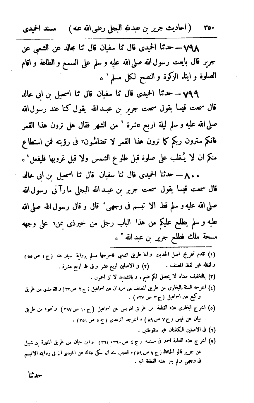 798 - حدثنا الحميدي قال ثنا سفيان قال ثنا مجالد عن الشعبي عن جرير قال : بايعت رسول الله صلى الله عليه و سلم على السمع والطاعة وإقام الصلاة وإيتاء الزكوة والنصح لكل مسلم