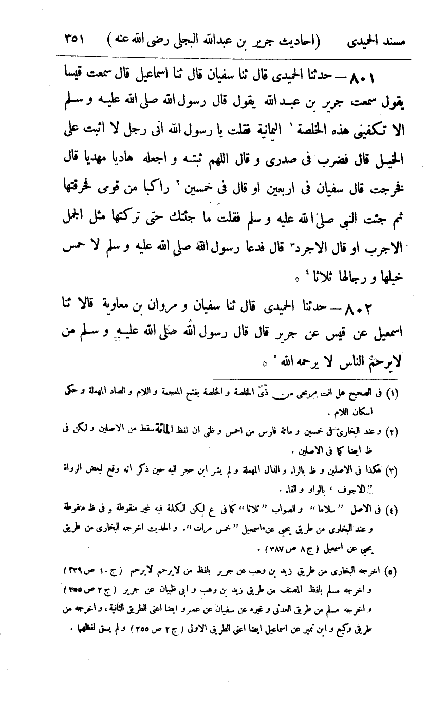 801 - حدثنا الحميدي قال ثنا سفيان قال ثنا إسماعيل قال سمعت قيسا يقول سمعت جرير بن عبد الله يقول قال رسول الله صلى الله عليه و سلم : ألا تكفيني هذه الخلصة اليمانية فقلت يا رسول الله إني رجل لا أثبت على الخيل قال فضرب في صدري وقال اللهم ثبته وأجعله هاديا مهديا قال فخرجت قال سفيان في أربعين أو قال في خمسين راكبا من قومي فحرقتها ثم جئت النبي صلى الله عليه و سلم فقلت ما جئتك حتى تركتها مثل الجمل الأجرب أو قال الأجرد قال فدعا رسول الله صلى الله عليه و سلم لا خمس خيلها ورجالها ثلاثا