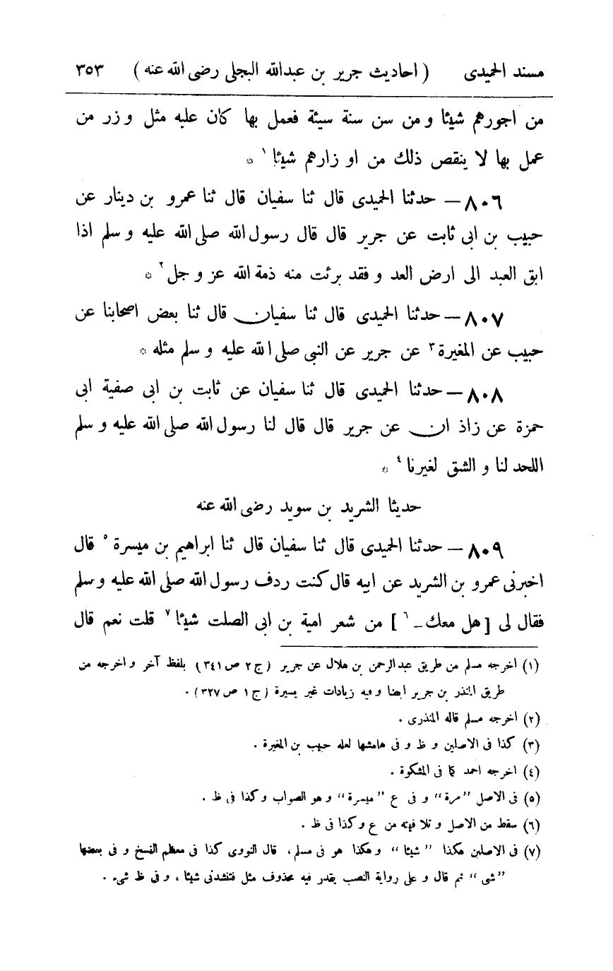 807 - حدثنا الحميدي قال ثنا سفيان قال ثنا بعض أصحابنا عن حبيب عن المغيرة عن جرير عن النبي صلى الله عليه و سلم : مثله