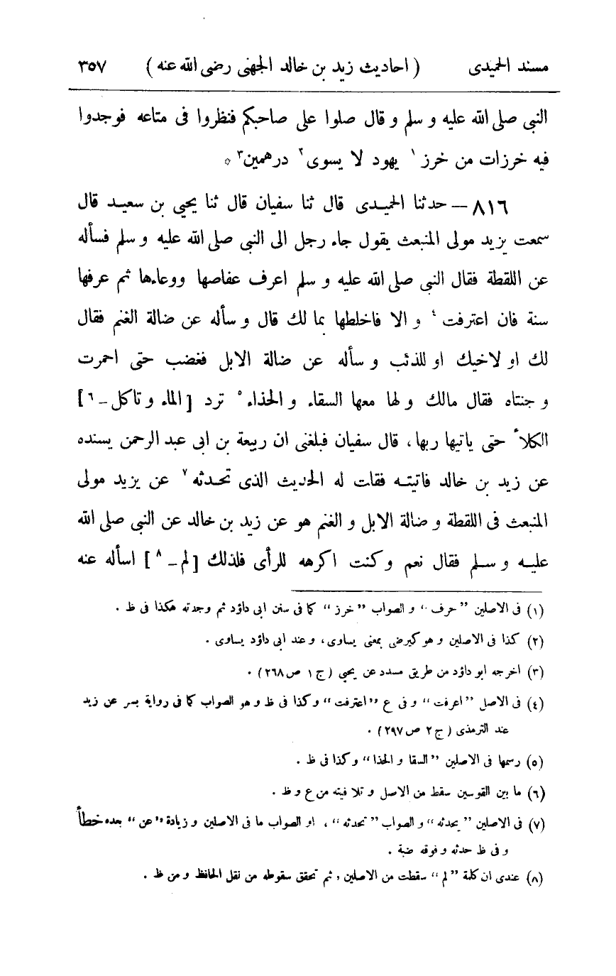 816 - حدثنا الحميدي قال ثنا سفيان قال ثنا يحيى بن سعيد قال سمعت يزيد مولى المنبعث يقول : جاء رجل الى النبي صلى الله عليه و سلم فسأله عن اللقطة فقال النبي صلى الله عليه و سلم أعرف عفاصها ووعاءها ثم عرفها سنة فإن اعترفت وإلا فاخلطها بما لك قال وسأله عن ضالة الغنم فقال لك أو لأخيك أو للذئب وسأله عن ضالة الإبل فغضب حتى احمرت وجنتاه فقال مالك ولها معها السقاء والحذاء ترد الماء وتأكل الكلأ حتي يأتيها ربها قال سفيان فبلغني أن ربيعة بن أبي عبد الرحمن يسنده عن زيد بن خالد فأتيته فقلت له الحديث الذي تحدثه عن يزيد مولى المنبعث في اللقطة وضالة الإبل والغنم هو عن زيد بن خالد عن النبي صلى الله عليه و سلم فقال نعم وكنت أكرهه للرأي فلذلك لم اسأله عنه ولو لا أنه أسنده ما سألته عن إسناده