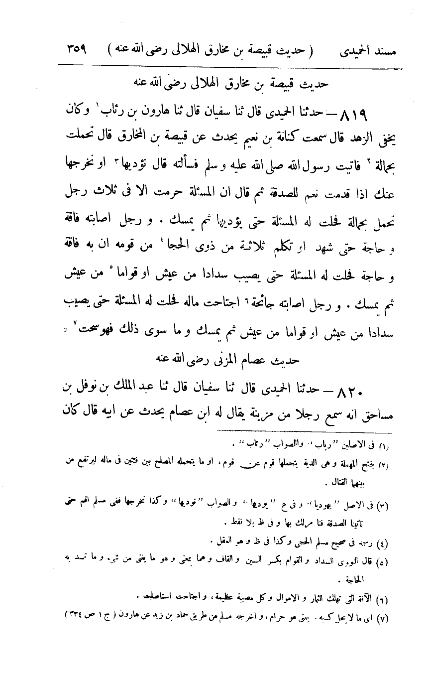 819 - حدثنا الحميدي قال ثنا سفيان قال ثنا هارون بن رئاب وكان يخفي الزهد قال سمعت كنانة بن نعيم يحدث عن قبيصة بن المخارق قال : تحملت بحمالة فأتيت رسول الله صلى الله عليه و سلم فسألته قال نؤديها أو نخرجها عنك إذا قدمت نعم للصدقة ثم قال ان المسئلة حرمت الا في ثلاث رجل تحمل بحمالة فحلت له المسئلة حتى يؤديها ثم يمسك ورجل أصابته فاقة وحاجة حتى شهد أو تكلم ثلاثة من ذوي الحجا من قومه أن به فاقة وحاجة فحلت له المسئلة حتى يصيب سدادا من عيش أو قوما من عيش ثم يمسك ورجل أصابته جائحة اجتاحت ماله فحلت له المسئلة حتى يصيب سدادا من عيش أو قوما من عيش ثم يمسك وما سوى ذلك فهو سحت