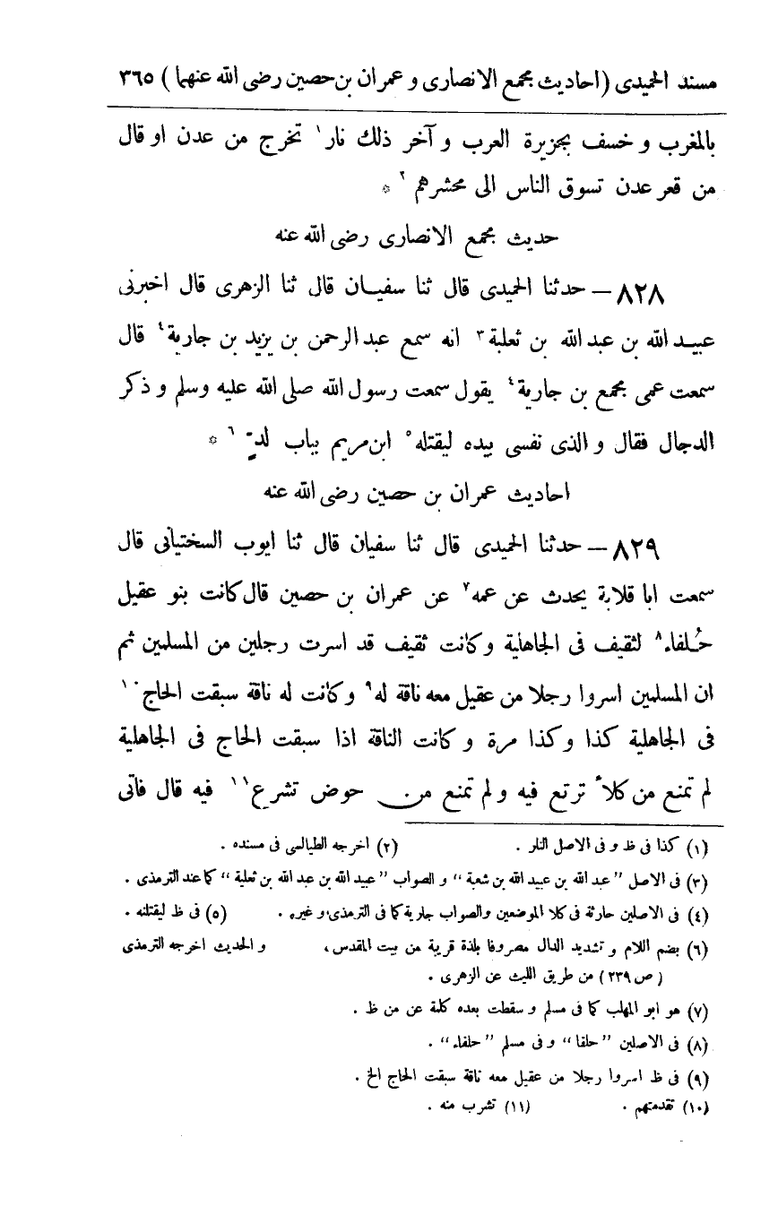828 - حدثنا الحميدي قال ثنا سفيان قال ثنا الزهري قال أخبرني عبيد الله بن عبد الله بن ثعلبة أنه سمع عبد الرحمن بن يزيد بن جارية قال سمعت عمي مجمع بن جارية يقول سمعت رسول الله صلى الله عليه و سلم وذكر الدجال فقال : والذي نفسي بيده ليقتله بن مريم بباب لد
