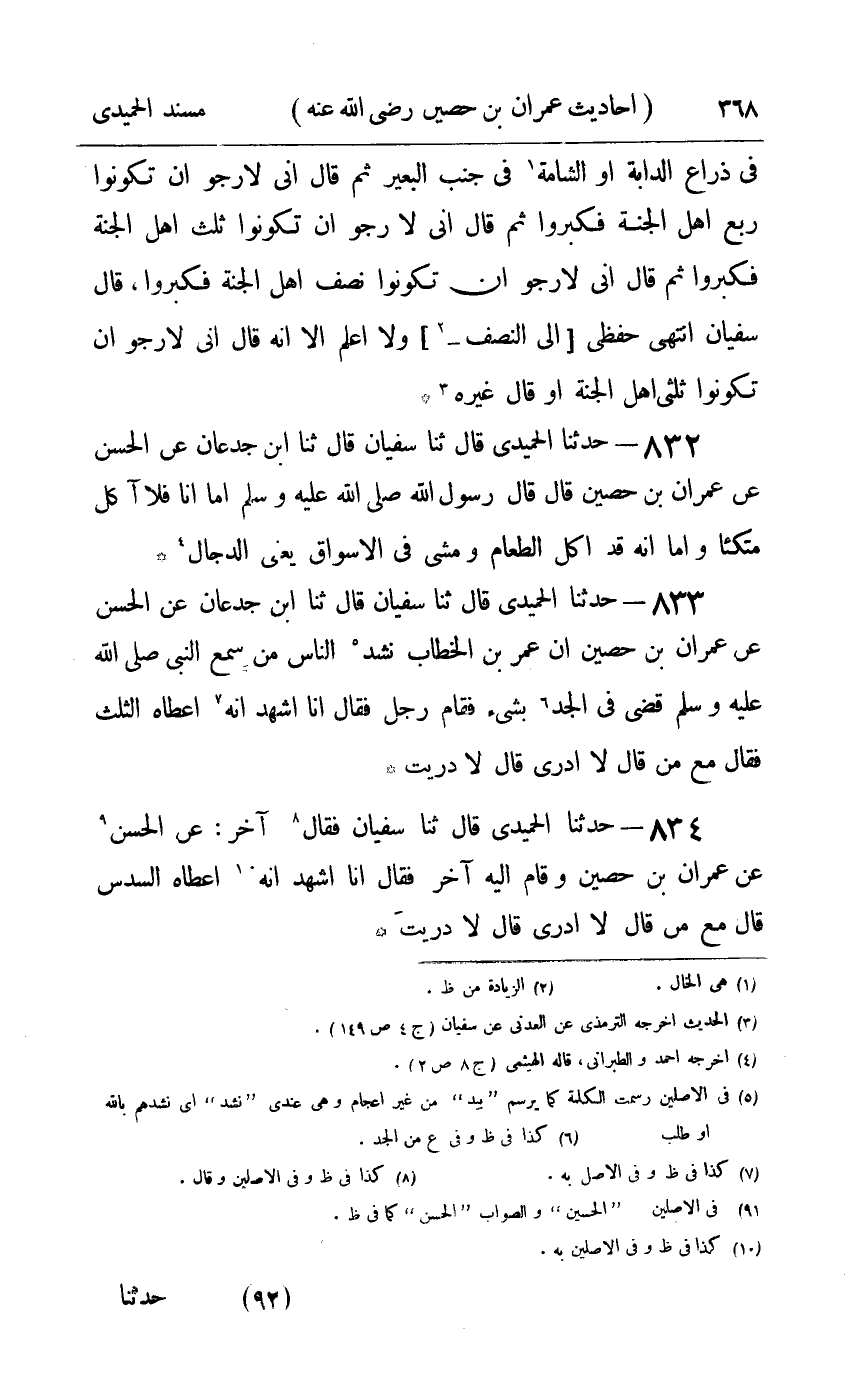 834 - حدثنا الحميدي قال ثنا سفيان فقال آخر عن الحسن عن عمران بن حصين : وقام اليه آخر فقال أنا اشهد أنه أعطاه السدس قال مع من قال لا أدري قال لا دريت