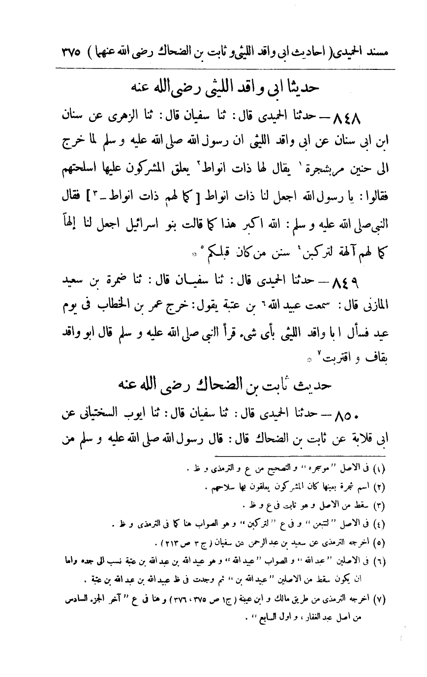 848 - حدثنا الحميدي قال ثنا سفيان قال ثنا الزهري عن سنان بن أبي سنان عن أبي واقد الليثي : أن رسول الله صلى الله عليه و سلم لما خرج الى حنين مر بشجرة يقال لها ذات أنواط يعلق المشركون عليها أسلحتهم فقالوا يا رسول الله اجعل لنا ذات أنواط كما لهم ذات أنواط فقال النبي صلى الله عليه و سلم الله أكبر هذا كما قالت بنو إسرائيل اجعل لنا إلها كما لهم آلهة لتركبن سنن من كان قبلكم