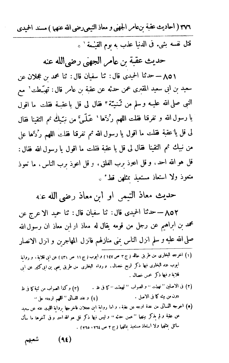 851 - حدثنا الحميدي قال ثنا سفيان قال ثنا محمد بن عجلان عن سعيد بن أبي سعيد المقبري عمن حدثه عن عقبة بن عامر قال : تهبطت مع النبي صلى الله عليه و سلم من ثنية فقال لي قل يا عقبة فقلت ما أقول يا رسول الله وتفرقنا فقلت اللهم ردها علي من نبيك ثم التقينا فقال لي قل يا عقبة فقلت ما أقول يا رسول الله ثم تفرقنا فقلت اللهم ردها على من نبيك ثم التقينا فقال لي قل يا عقبة فقلت ما أقول يا رسول الله فقال قل هو الله أحد وقل أعوذ برب الفلق وقل أعوذ برب الناس ما تعوذ متعوذ ولا استعاذ مستعيذ بمثلهن قط