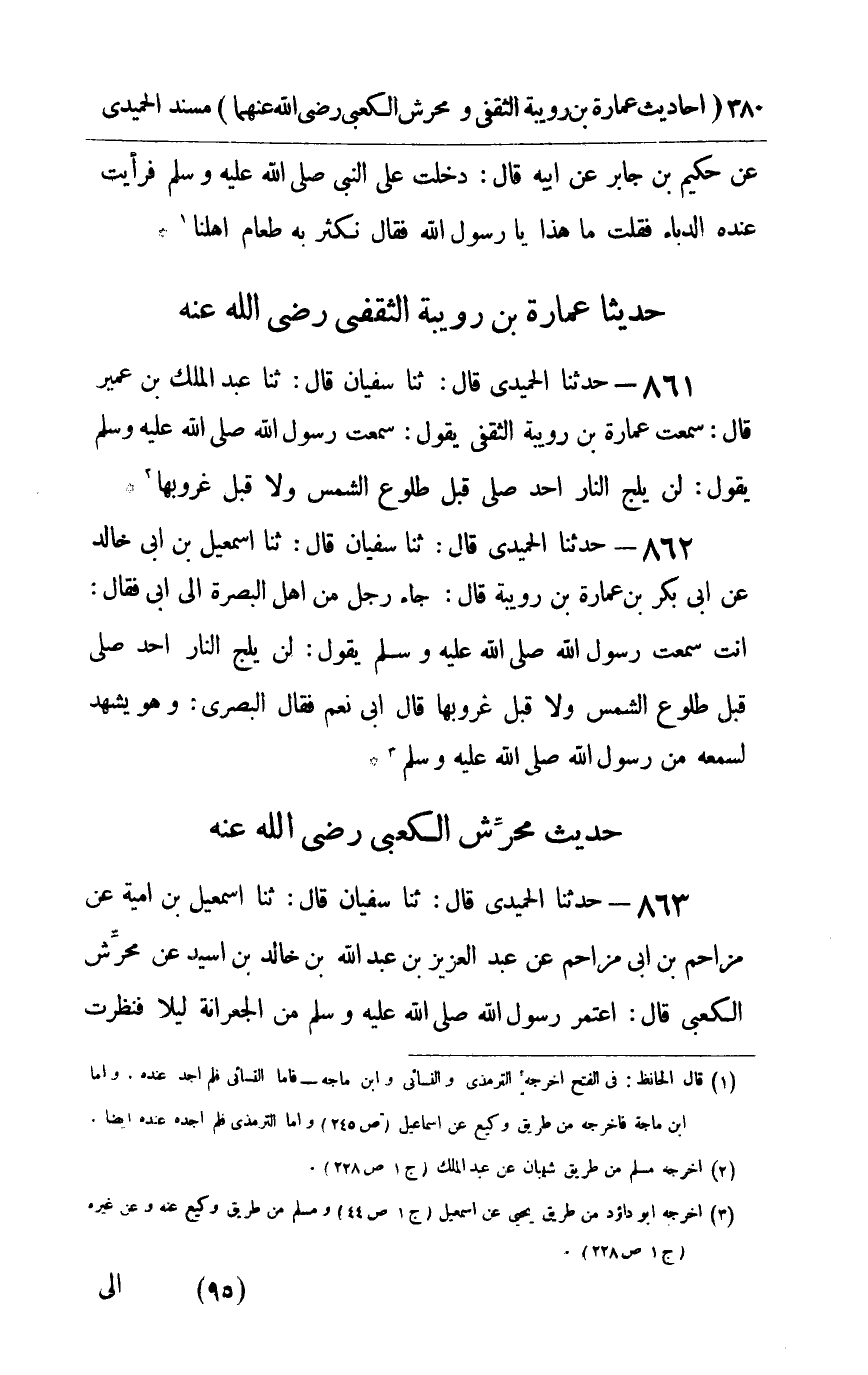 861 - حدثنا الحميدي قال ثنا سفيان قال ثنا عبد الملك بن عمير قال سمعت عمارة بن رويبة الثقفي يقول سمعت رسول الله صلى الله عليه و سلم يقول : لن يلج النار أحد صلى قبل طلوع الشمس ولا قبل غروبها