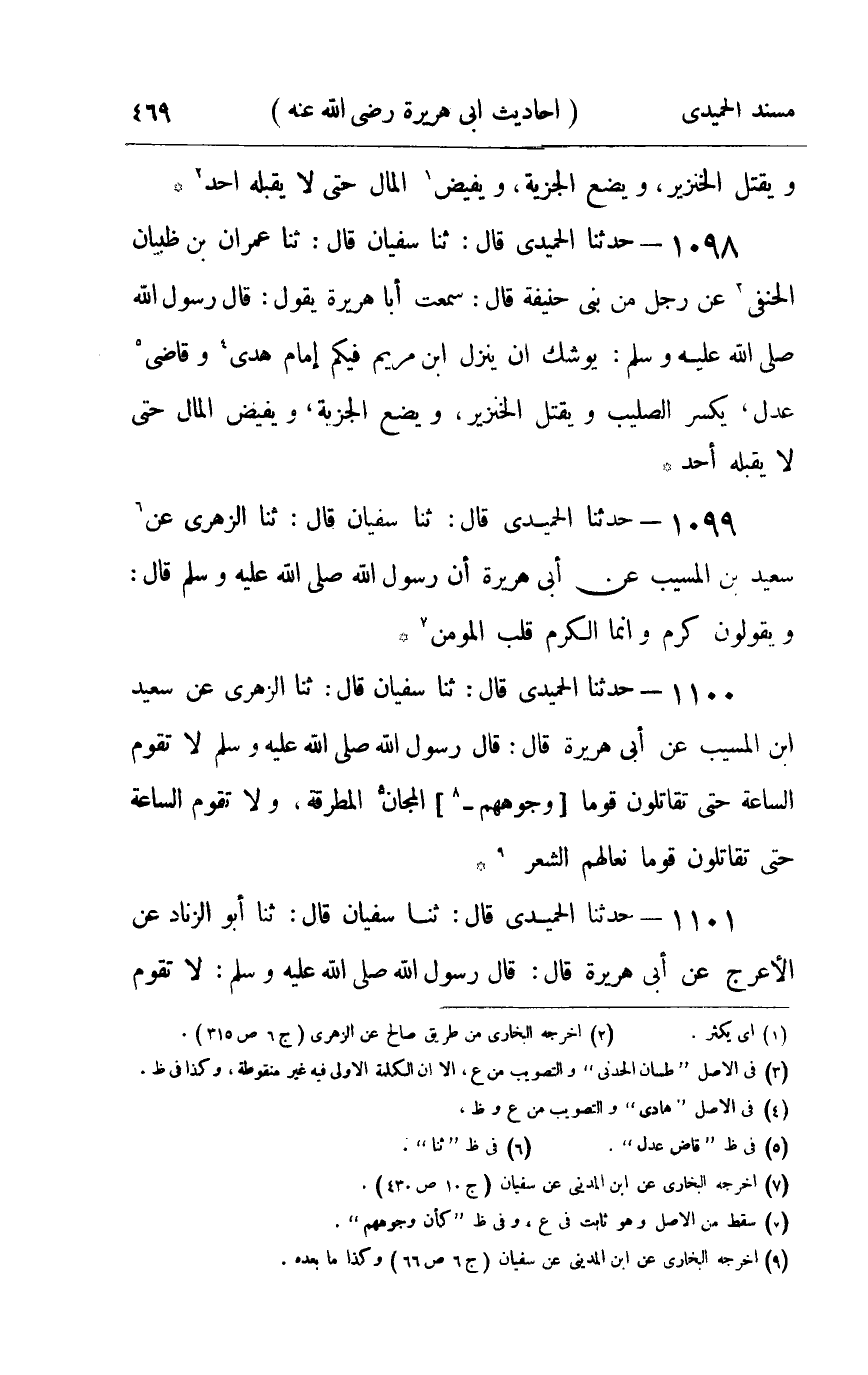 1098 - حدثنا الحميدي قال ثنا سفيان قال ثنا عمران بن ظبيان الحنفي عن رجل من بني حنيفة قال سمعت أبا هريرة يقول قال رسول الله صلى الله عليه و سلم : يوشك أن ينزل بن مريم فيكم إمام هدى وقاضي عدل يكسر الصليب ويقتل الخنزير ويضع الجزية ويفيض المال حتى لا يقبله أحد