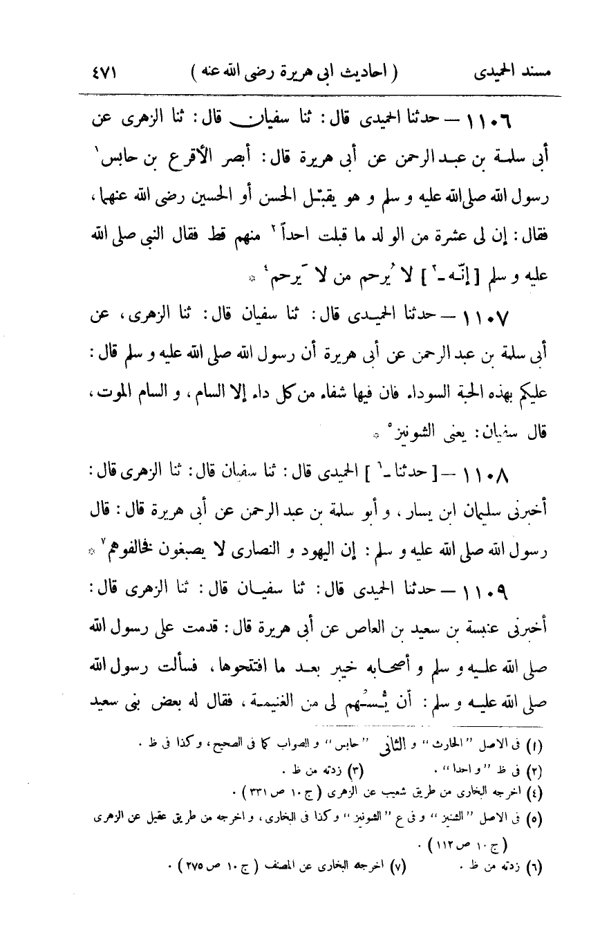 1106 - حدثنا الحميدي قال ثنا سفيان قال ثنا الزهري عن أبي سلمة بن عبد الرحمن عن أبي هريرة قال أبصر الأقرع بن حابس رسول الله صلى الله عليه و سلم وهو يقبل الحسن أو الحسين رضي الله عنهما فقال إن لي عشرة من الولد ما قبلت أحدا منهم قط فقال النبي صلى الله عليه و سلم : إنه لا يرحم من لا يرحم