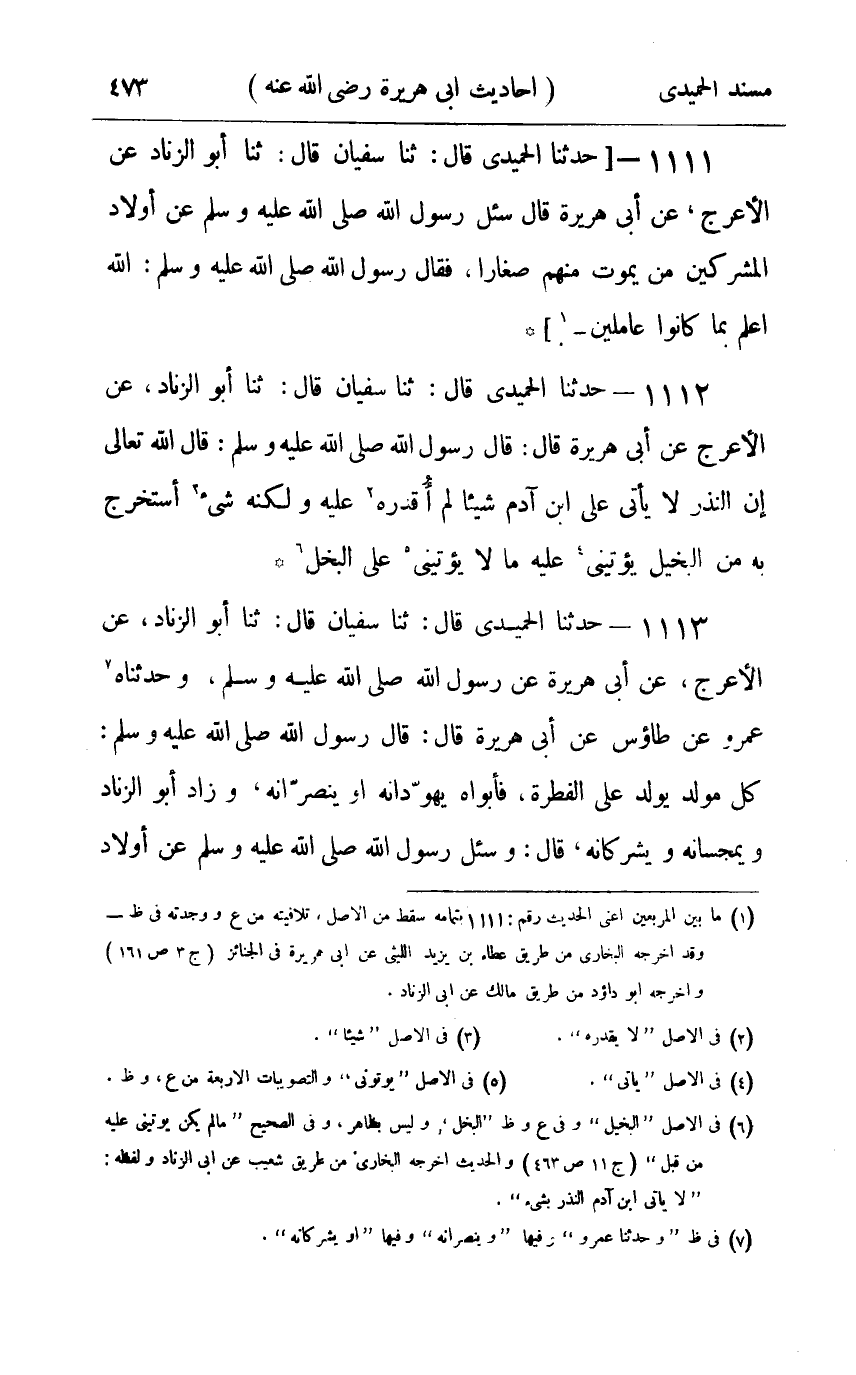 1113 - حدثنا الحميدي قال ثنا سفيان قال ثنا أبو الزناد عن الأعرج عن أبي هريرة عن رسول الله صلى الله عليه و سلم وحدثناه عمرو عن طاوس عن أبي هريرة قال قال رسول الله صلى الله عليه و سلم : كل مولد يولد على الفطرة فأبواه يهودانه أو ينصرانه وزاد أبو الزناد ويمجسانه ويشركانه قال وسئل رسول الله صلى الله عليه و سلم عن أولاد المشركين من يموت منهم صغارا فقال الله أعلم بما كانوا عاملين