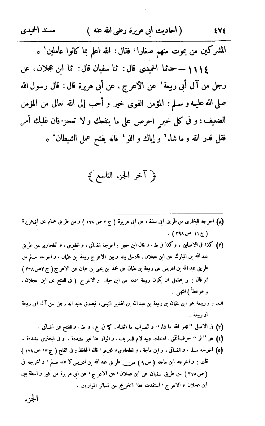 1114 - حدثنا الحميدي قال ثنا سفيان قال ثنا بن عجلان عن رجل من آل أبي ربيعة عن الأعرج عن أبي هريرة قال قال رسول الله صلى الله عليه و سلم : المؤمن القوي خير وأحب إلى الله تعالى من المؤمن الضعيف وفي كل خير أحرص على ما ينفعك ولا تعجز فإن غلبك أمر فقل قدر الله وما شاء وإياك واللو فإنه يفتح عمل الشيطان [ ص 475 ] أول الجزء العاشر