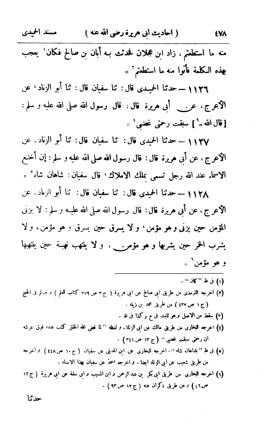 1128 - حدثنا الحميدي قال ثنا سفيان قال ثنا أبو الزناد عن الأعرج عن أبي هريرة قال قال رسول الله صلى الله عليه و سلم : لا يزني المؤمن حين يزني وهو مؤمن ولا يسرق حين يسرق وهو مؤمن ولا يشرب الخمر حين يشربها وهو مؤمن ولا ينتهب نهبة حين ينتهبها وهو مؤمن