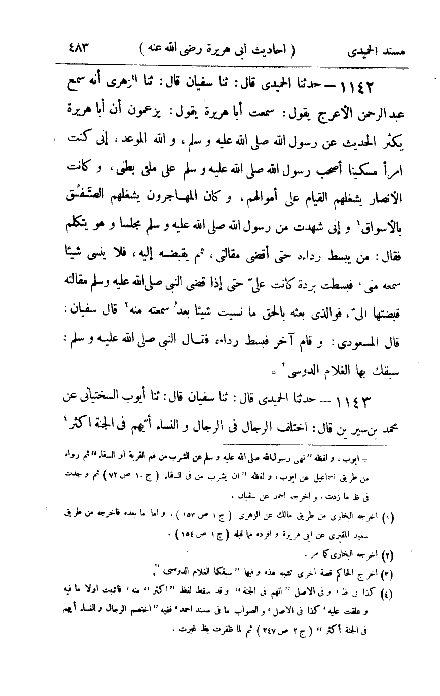 1142 - حدثنا الحميدي قال ثنا سفيان قال ثنا الزهري أنه سمع عبد الرحمن الأعرج يقول سمعت أبا هريرة يقول يزعمون أن أبا هريرة يكثر الحديث عن رسول الله صلى الله عليه و سلم والله الموعد إني كنت امرأ مسكينا أصحب رسول الله صلى الله عليه و سلم على ملىء بطني وكانت الأنصار يشغلهم القيام على أموالهم وكان المهاجرين يشغلهم الصفق بالأسواق وإني شهدت من رسول الله صلى الله عليه و سلم مجلسا وهو يتكلم فقال : من يبسط رداءه حتى أقضى مقالتي ثم يقبضه إليه فلا ينسى شيئا سمعه مني فبسطت بردة كانت علي حتى إذا قضى النبي صلى الله عليه و سلم مقالته قبضتها الي فوالذي بعثه بالحق ما نسيت شيئا بعد سمعته منه قال سفيان قال المسعودي وقام آخر فبسط رداءه فقال النبي صلى الله عليه و سلم سبقك بها الغلام الدوسي