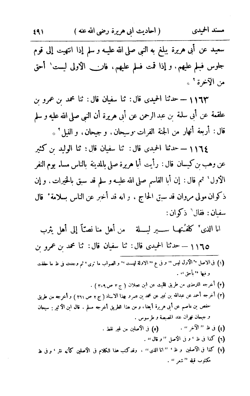 1163 - حدثنا الحميدي قال ثنا سفيان قال ثنا محمد بن عمرو بن علقمة عن أبي سلمة بن عبد الرحمن عن أبي هريرة أن النبي صلى الله عليه و سلم قال : أربعة أنهار من الجنة الفرات وسيحان وجيحان والنيل