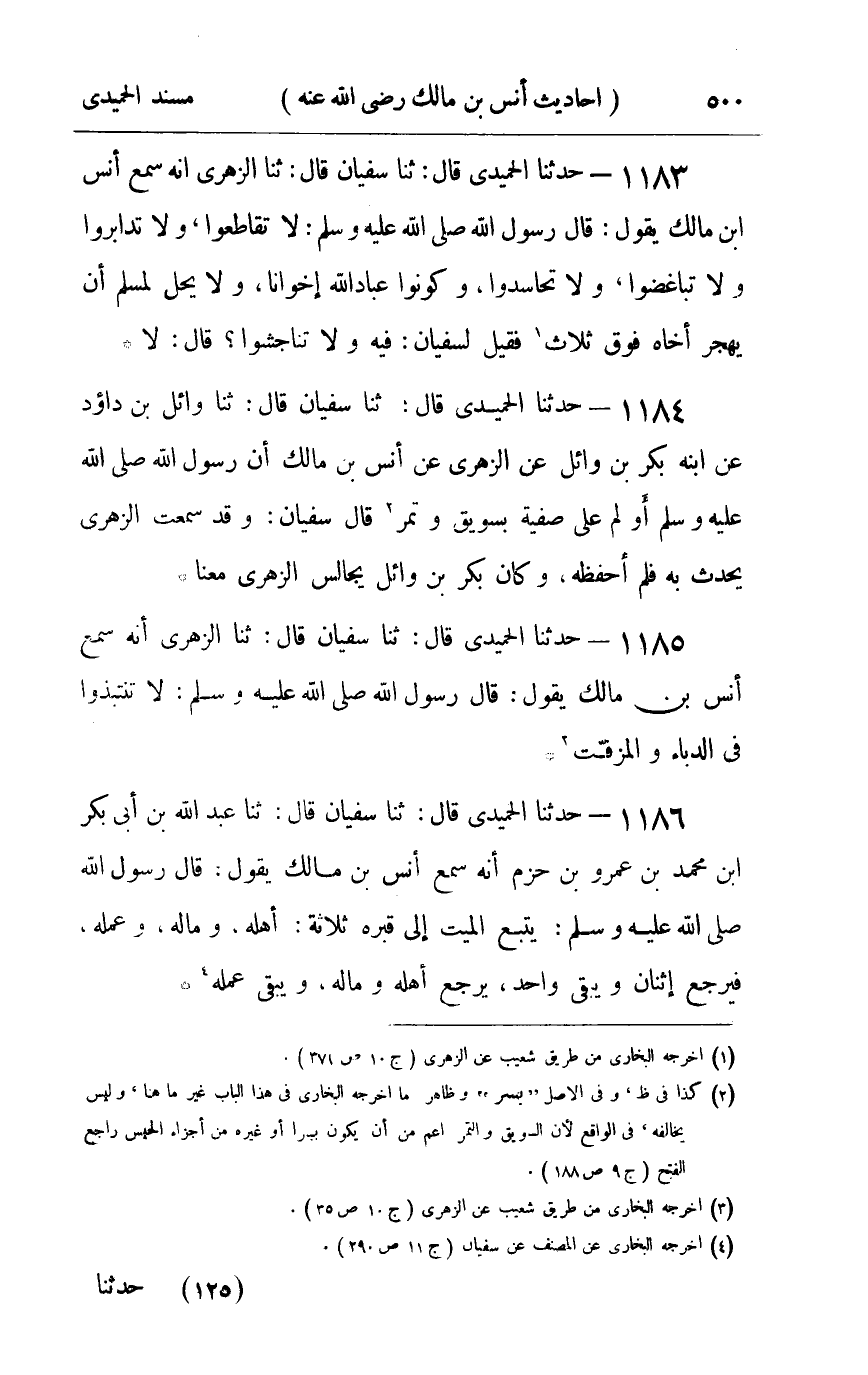 1183 - حدثنا الحميدي قال ثنا سفيان قال ثنا الزهري أنه سمع أنس بن مالك يقول قال رسول الله صلى الله عليه و سلم : لا تقاطعوا ولا تدابروا ولا تباغضوا ولا تحاسدوا وكونوا عباد الله إخوانا ولا يحل لمسلم أن يهجر أخاه فوق ثلاث فقيل لسفيان فيه ولا تناجشوا قال لا
