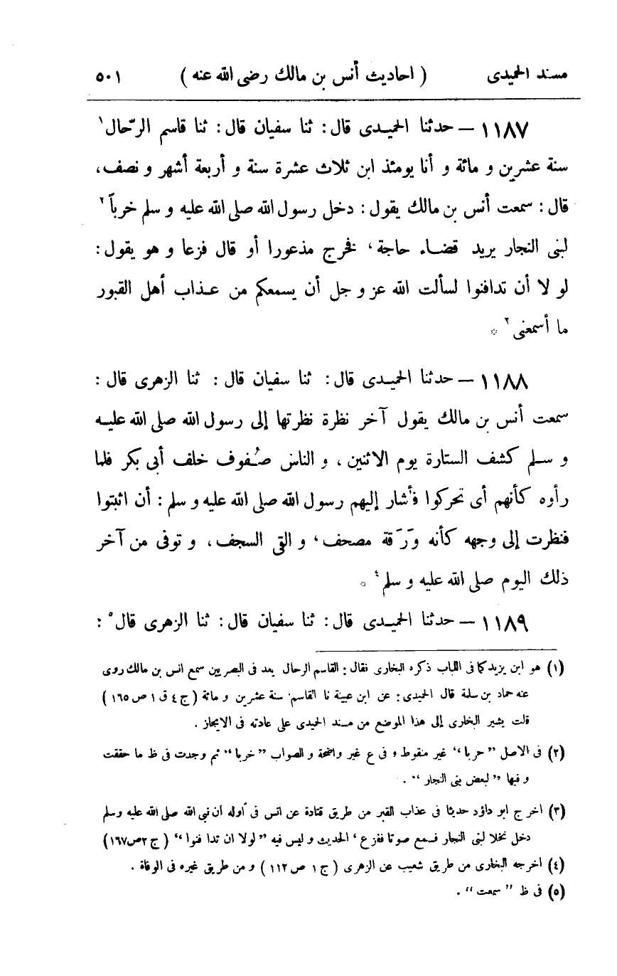 1187 - حدثنا الحميدي قال ثنا سفيان قال ثنا قاسم الرحال سنة عشرين ومائة وأنا يومئذ بن ثلاث عشرة سنة وأربعة أشهر ونصف قال سمعت أنس بن مالك يقول : دخل رسول الله صلى الله عليه و سلم خربا لبني النجار يريد قضاء حاجة فخرج مذعورا أو قال فزعا وهو يقول لولا أن تدافنوا لسألت الله عز و جل أن يسمعكم من عذاب أهل القبور ما أسمعني
