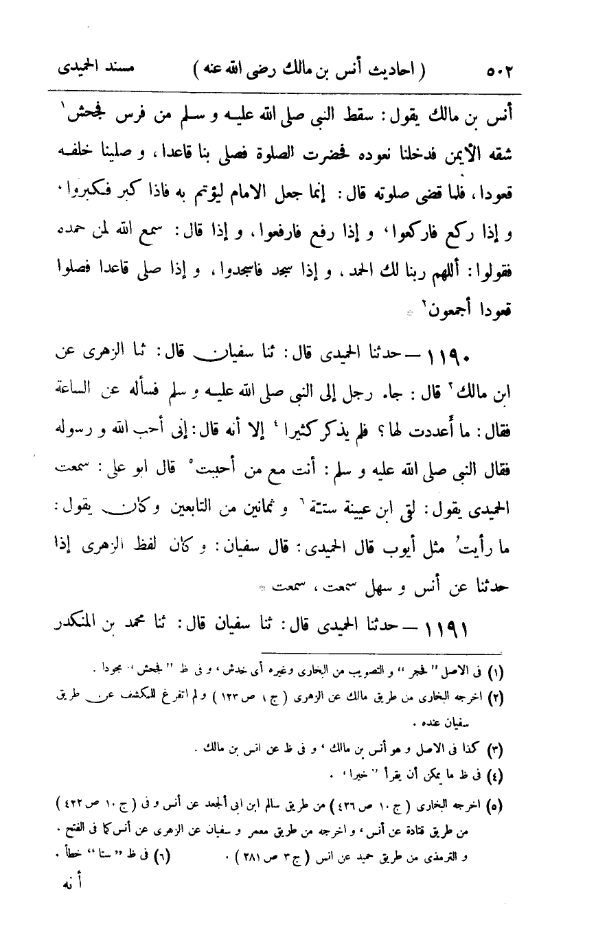 1190 - حدثنا الحميدي قال ثنا سفيان قال ثنا الزهري عن بن مالك قال : جاء رجل إلى النبي صلى الله عليه و سلم فسأله عن الساعة فقال ما أعددت لها فلم يذكر كثيرا إلا أنه قال إني أحب الله ورسوله فقال النبي صلى الله عليه و سلم أنت مع من أحببت قال أبو علي سمعت الحميدي يقول لقى بن عيينة ستة وثمانين من التابعين وكان يقول ما رأيت مثل أيوب قال الحميدي قال سفيان وكان لفظ الزهري إذا حدثنا عن أنس وسهل سمعت سمعت