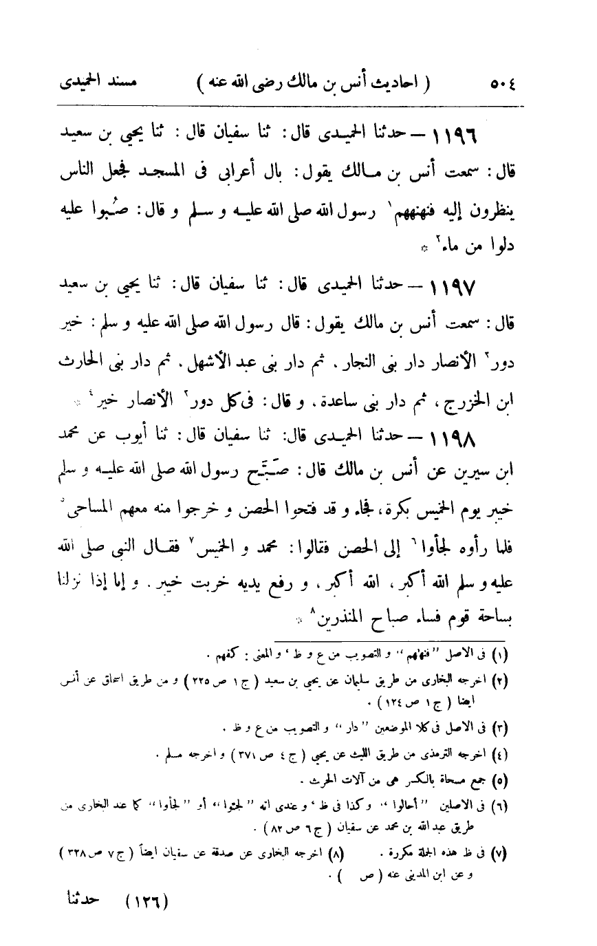 1197 - حدثنا الحميدي قال ثنا سفيان قال ثنا يحيى بن سعيد قال سمعت أنس بن مالك يقول قال رسول الله صلى الله عليه و سلم : خير دور الأنصار دار بني النجار ثم دار بني عبد الأشهل ثم دار بني الحارث بن الخزرج ثم دار بني ساعدة وقال في كل دور الأنصار خير