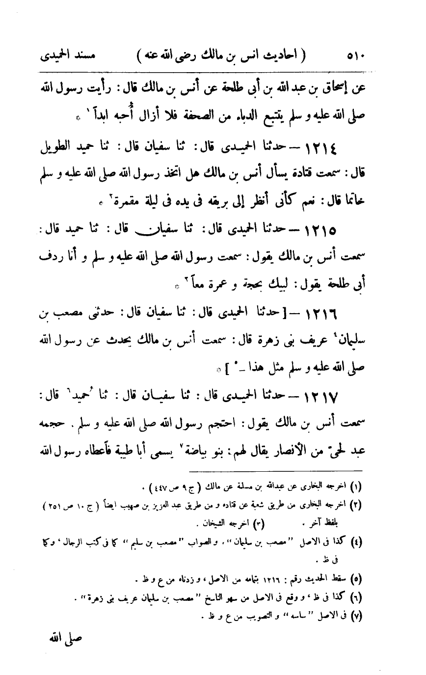 1216 - حدثنا الحميدي قال ثنا سفيان قال حدثني مصعب بن سليمان عريف بن زهرة سمعت أنس بن مالك يحدث عن رسول الله صلى الله عليه و سلم : مثل هذا