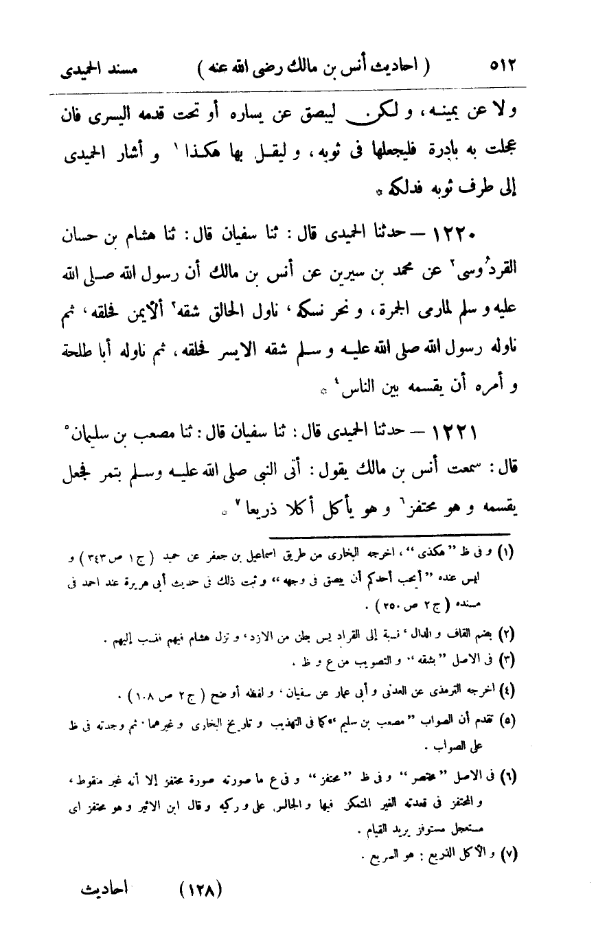 1221 - حدثنا الحميدي قال ثنا سفيان قال ثنا مصعب بن سليمان قال سمعت أنس بن مالك يقول : أتى النبي صلى الله عليه و سلم بتمر فجعل يقسمه وهو محتفز وهو يأكل أكلا ذريعا