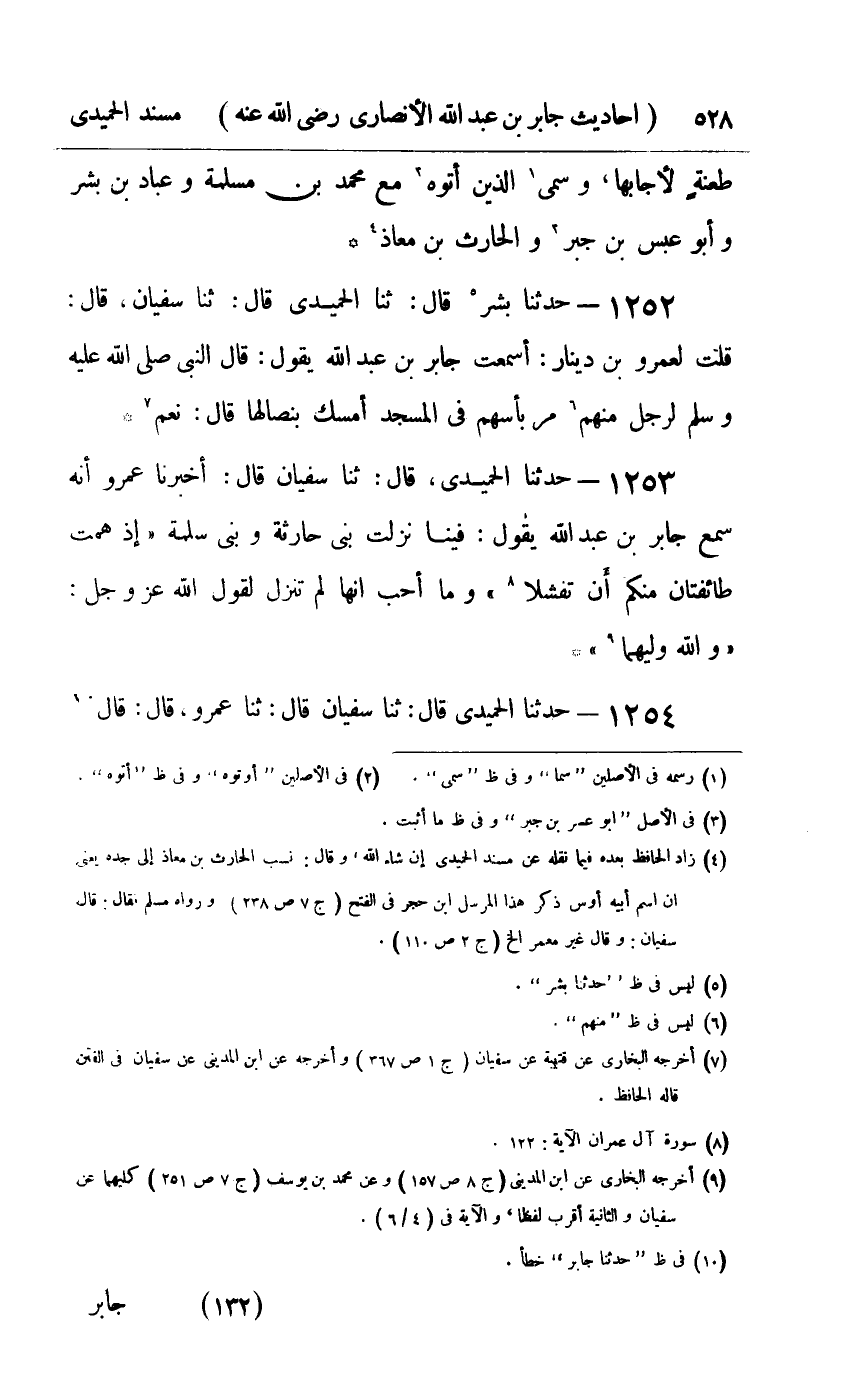 1253 - حدثنا الحميدي قال ثنا سفيان قال أخبرنا عمرو أنه سمع جابر بن عبد الله يقول : فينا نزلت بني حارثة وبني سلمة إذ همت طائفتان منكم أن تفشلا وما أحب أنها لم تنزل لقول الله عز و جل والله وليهما