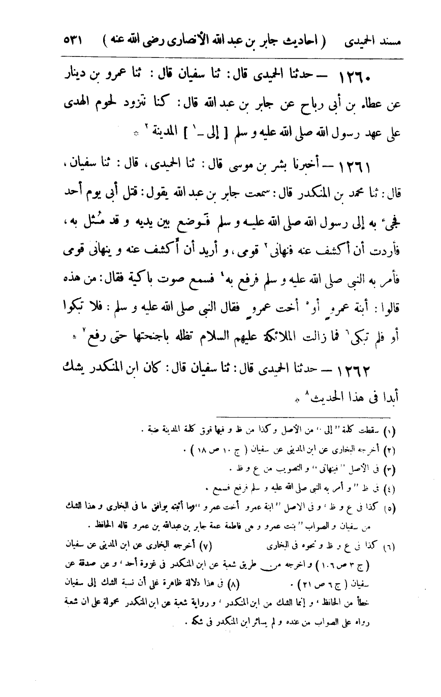 1261 - أخبرنا بشر بن موسى قال ثنا الحميدي قال ثنا سفيان قال ثنا محمد بن المنكدر قال : سمعت جابر بن عبد الله يقول قتل أبي يوم أحد فجيء به إلى رسول الله صلى الله عليه و سلم فوضع بين يديه وقد مثل به فأردت أن أكشف عنه فنهاني قومي وأريد أن أكشف عنه وينهاني قومي فأمر به النبي صلى الله عليه و سلم فرفع به فسمع صوت باكية فقال من هذه قالوا ابنة عمر أو أخت عمرو فقال النبي صلى الله عليه و سلم فلا تبكوا أو فلم تبكي فما زالت الملائكة عليهم السلام تظله بأجنحتها حتى رفع