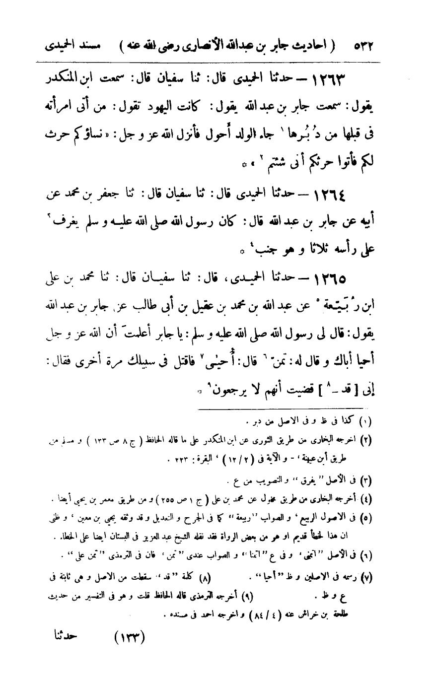 1263 - حدثنا الحميدي قال ثنا سفيان قال سمعت بن المنكدر يقول سمعت جابر بن عبد الله يقول : كانت اليهود تقول من أتى امرأته في قبلها من دبرها جاء الولد أحول فأنزل الله عز و جل نساؤكم حرث لكم فأتوا حرثكم أنى شئتم